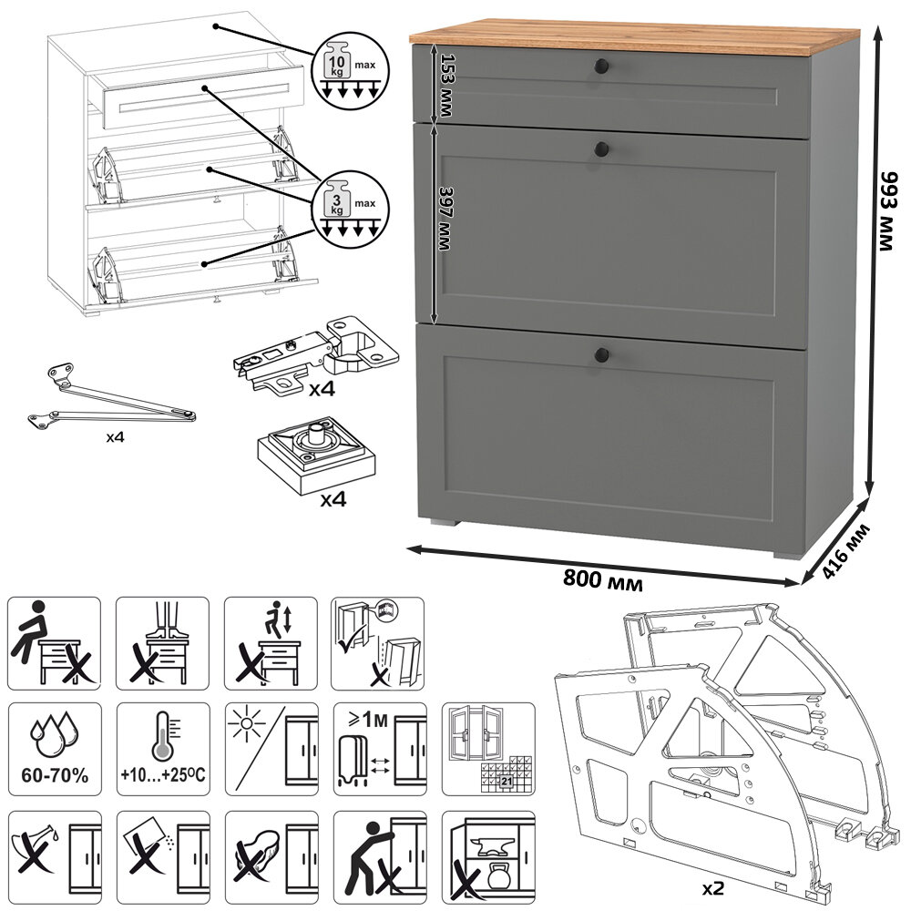 | Комплектация | с выдвижным ящиком для мелочей сверху и двумя откидными дверками с полками для обуви снизу; каждая откидная дверь расчитана для хранения и размещения 6 пар невысокой обуви; скрытые направляющие выдвижных ящиков; двери оснащены четырехшарнирными петлями без доводчиков; регулируемые опоры; лицевая фурнитура в виде черных аккуратных ручек на фасадах |