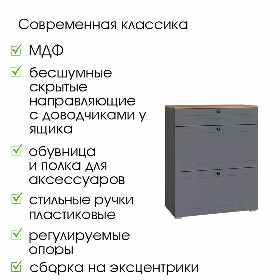 | Дополнительная информация | ящик для хранения с бесшумными направляющими скрытого монтажа с доводчиками, ниже 2 откидных фасада на четырехшарнирных петлях и барных кронштейнах (за верхним фасадом расположена полка для обувных аксессуаров), матовые металлические ручки - долгосрочность использования, пластиковые регулируемые опоры - простота регулировки при неровностях пола, надежная фурнитура - гарантия длительной эксплуатации, корпус ЛДСП 1,6 см, фасады МДФ 1,9 см, кромка ПВХ 0,4 и 2,0 мм, максимальная нагрузка на столешницу до 10 кг, максимальная нагрузка на ящик для хранения до 3 кг, максимальная нагрузка на каждую обувницу до 3 кг, во избежание опрокидывания и травмобезопасности предусмотрено крепление к стене (в комплекте) |