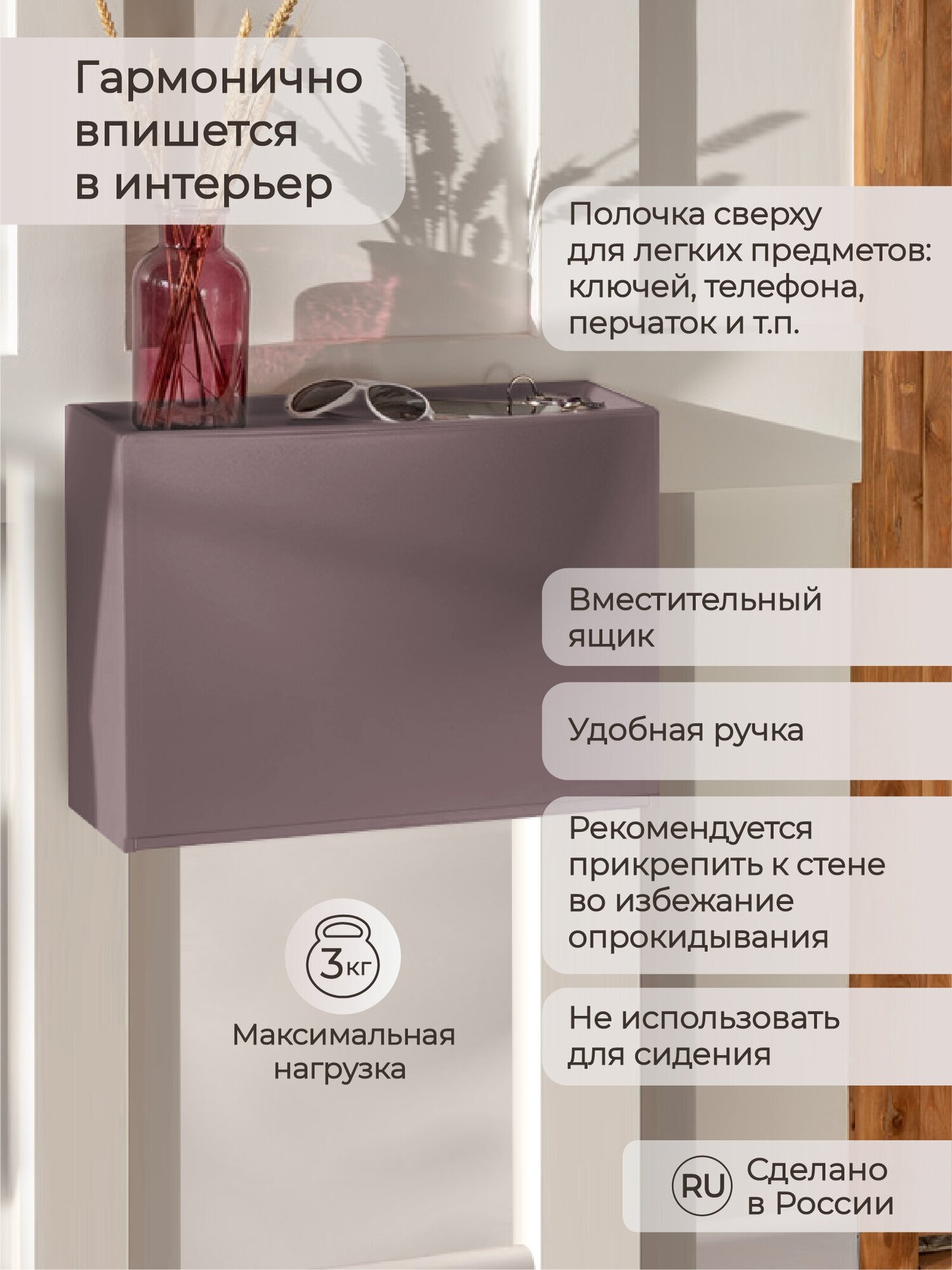 | Дополнительная информация | верхняя полка обувницы подходит для хранения легких предметов: ключей, кошельков, перчаток |