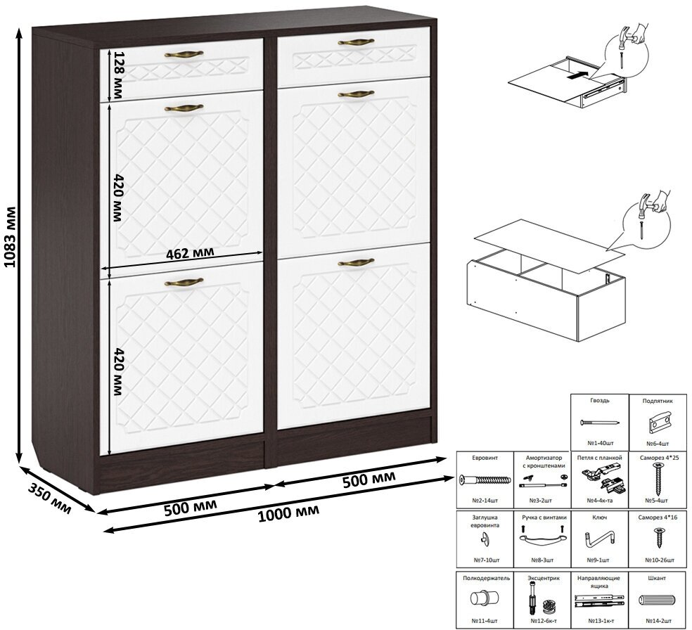 | Комплектация | конструктивно это две высокие тумбы, объединенных в единый блок, каждая тумба для обуви оборудована ящиком для мелочей сверцу и двумя отделениями с откидными фасадами для обуви, для фиксации откидных фасадов используется газлифт мебельный, выдвижные ящики установлены на металлические направляющие, обеспечивающие надёжное прямолинейное движение, двери закреплены на четырёхшарнирных петлях |
