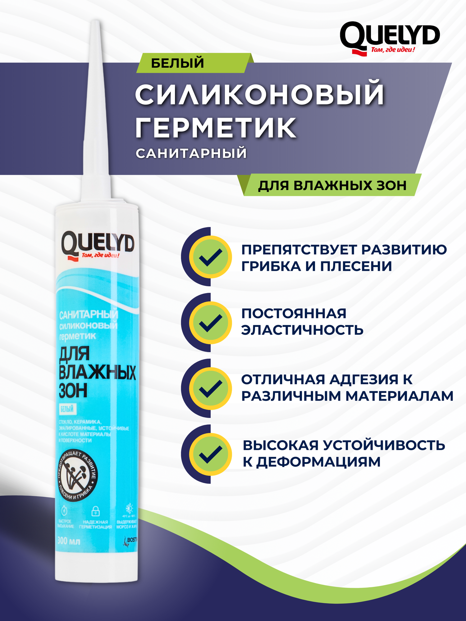 Силиконовый герметик Quelyd для влажных и сухих зон белый 300 мл