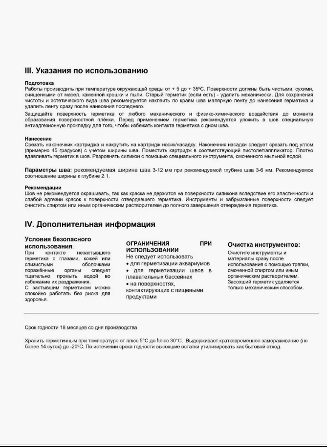 | Особенности | влагостойкость / морозостойкий / термостойкий / устойчивый к УФ-излучению / эластичность |