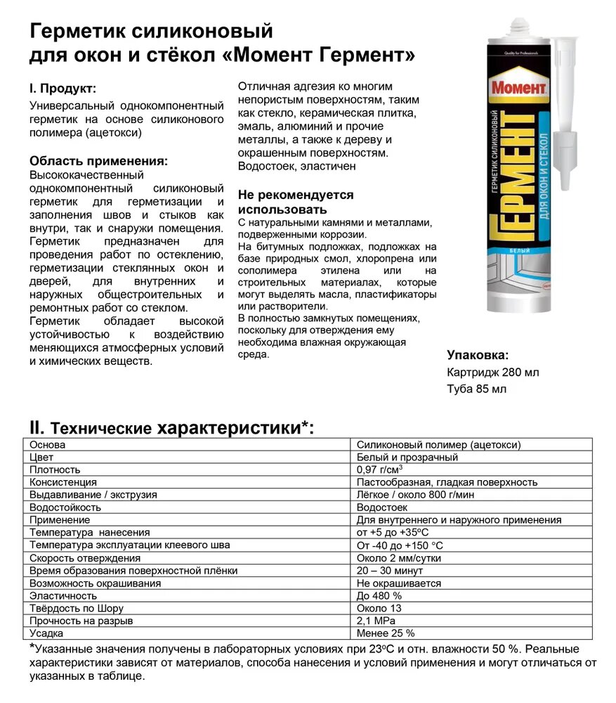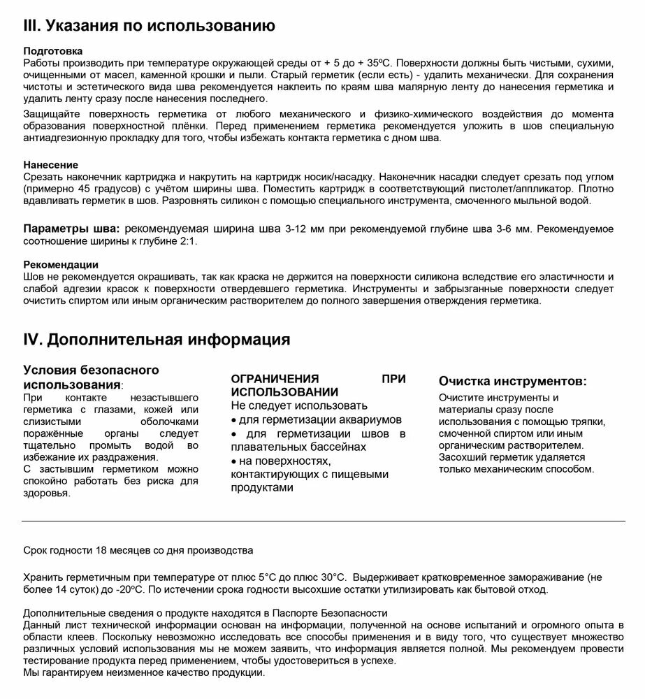 | Дополнительная информация | Не следует использовать: для герметизации аквариумов; для герметизации швов в плавательных бассейнах; на поверхностях, контактирующих с пищевыми продуктами; для зеркал. |