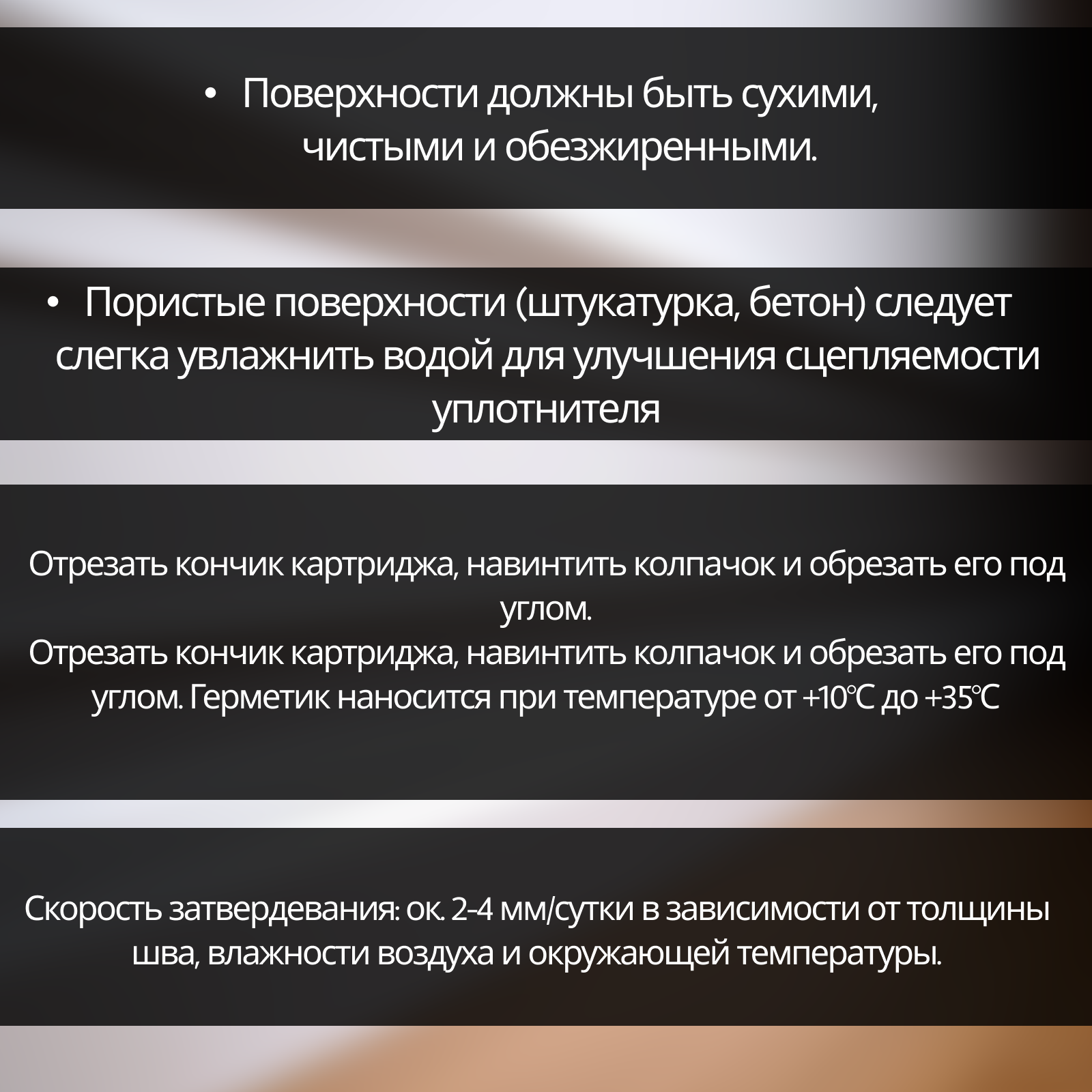 | Назначение | для внутренних работ / для кровли / для наружных работ / для окон / для труб |