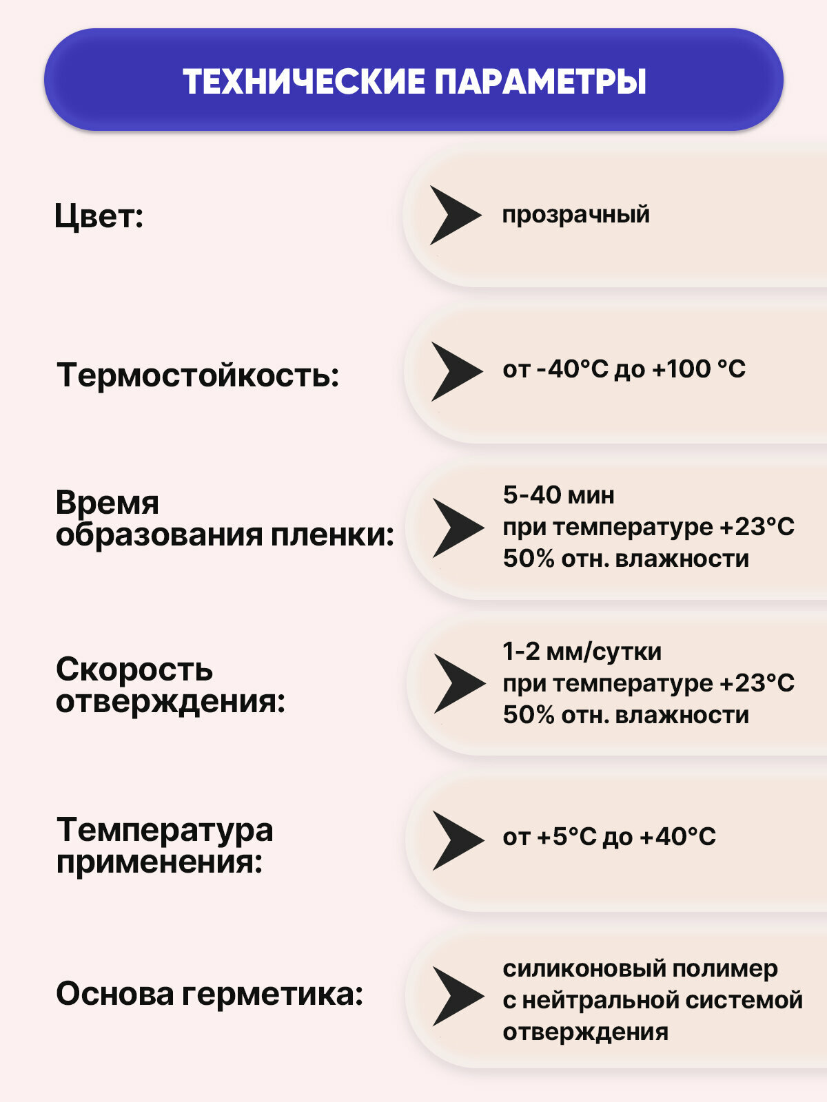 | Дополнительная информация | не использовать на влажных поверхностях, не следует использовать на битумных поверхностях, ограниченно на вулканизированной резине, хлоропрене и других строительных материалах, выделяющих масла, пластификаторы или растворители; герметик не предназначен для герметизации швов из природного камня: гранит, песчаник, мрамор и прочие; неиспользовать герметик на чувствительных металлических поверхностях (медь и сплавы, содержащие медь), на полиэтилене и полипропилене, так как адгезия с данными материалами отсутствует |