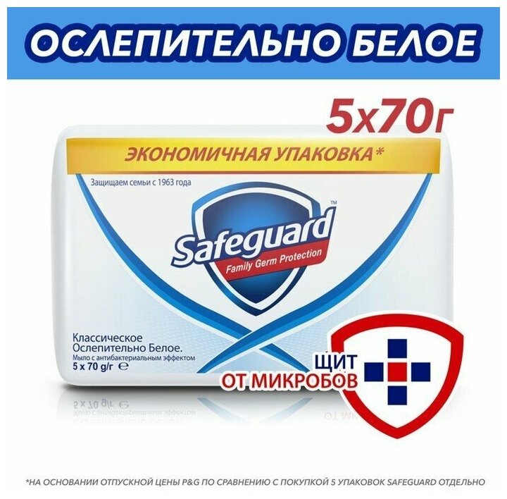 Мыло туалетное Safeguard Классическое ослепительно белое, 5 шт. по 70 г