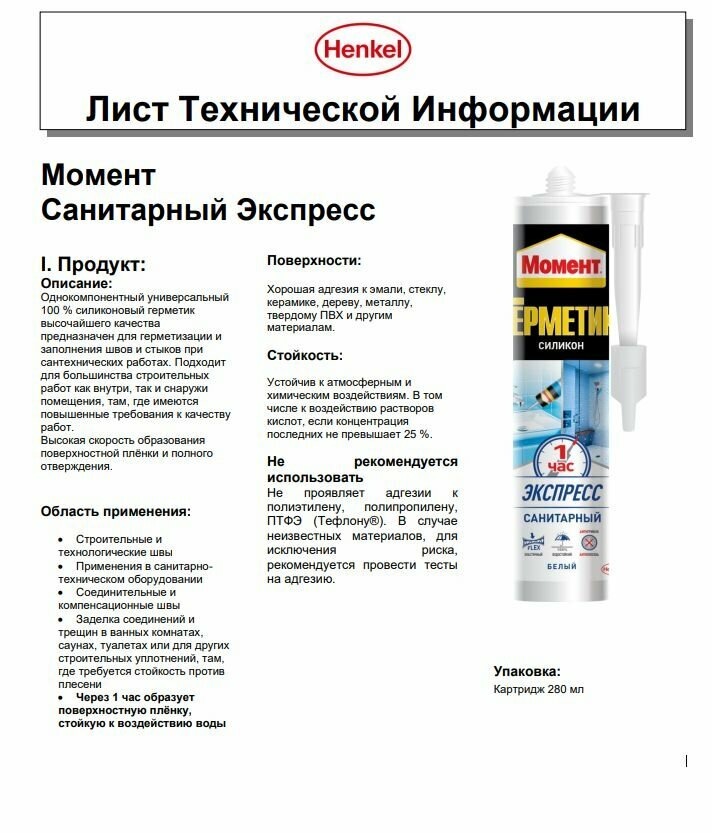 | Дополнительная информация | не следует использовать для герметизации аквариумов, для герметизации швов в плавательных бассейнах, на поверхностях, контактирующих с пищевыми продуктами |