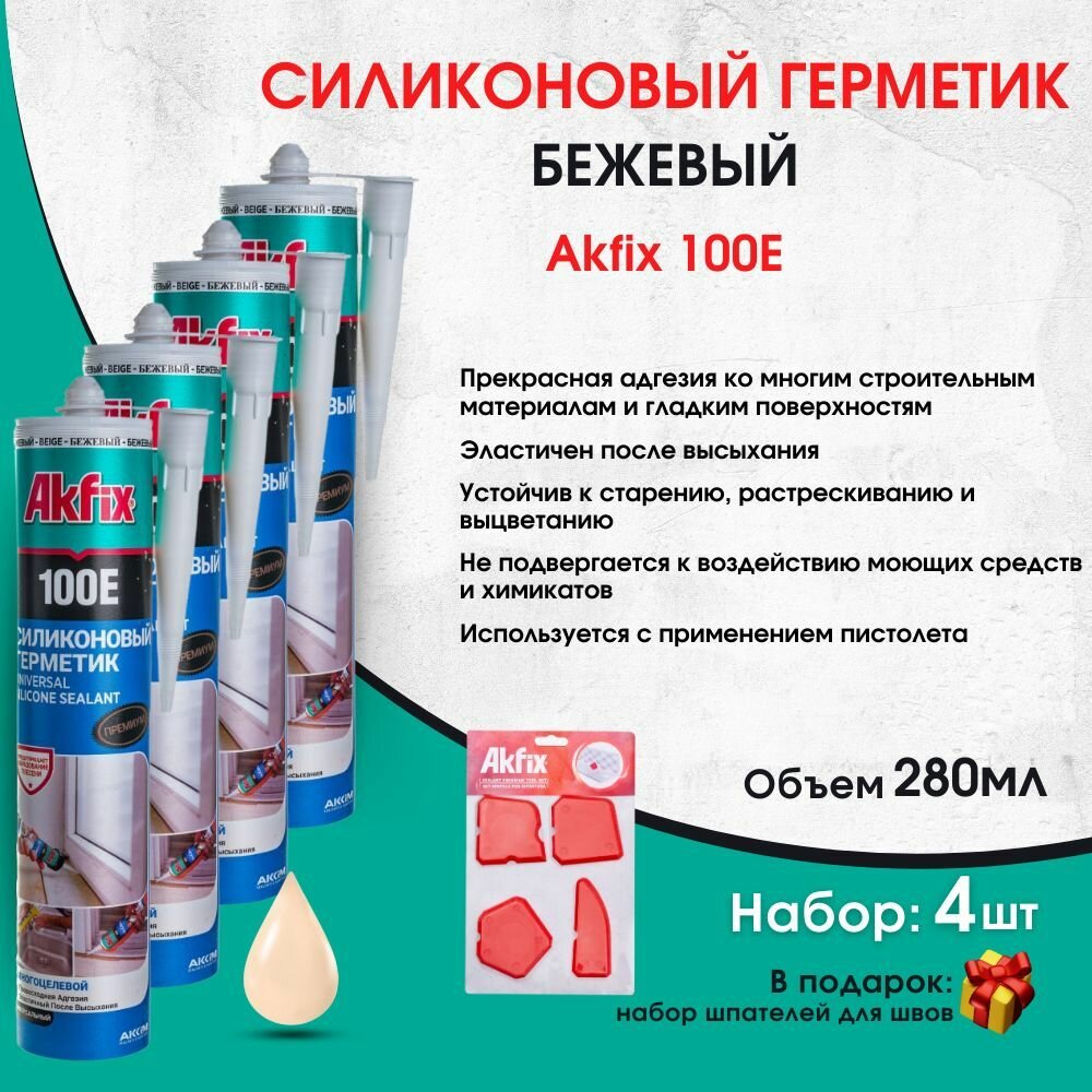 Купить 100E Универсальный силиконовый герметик Akfix, 280 мл, бежевый, 4 штуки