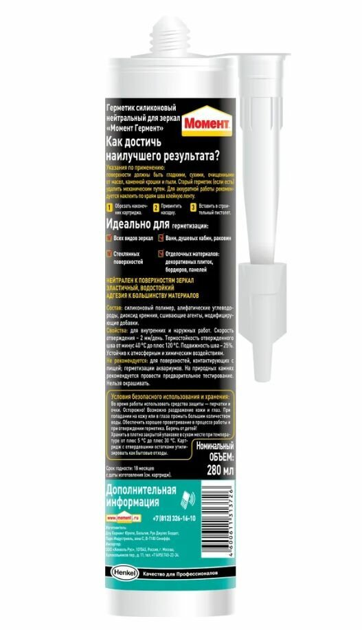 | Подробная комплектация | Герметик силиконовый нейтральный для зеркал Момент Гермент прозрачный 280 мл. |