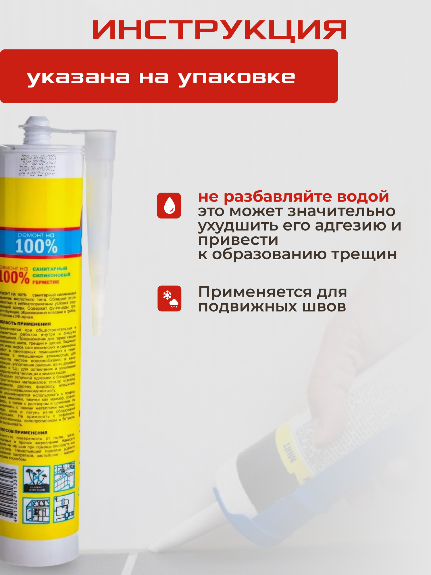 | Дополнительная информация | Температура нанесения: от +5°C до + 60°C; не рекомендуется использовать с природными камнями, такими как мрамор, гранит, кварц, а также с раствором и цементом, не применять с такими металлами, как свинец, медь, цинк и латунь из-за образования коррозии, не применять с тефлоном, полиэтиленом, полипропиленом и битумом; не окрашивать |