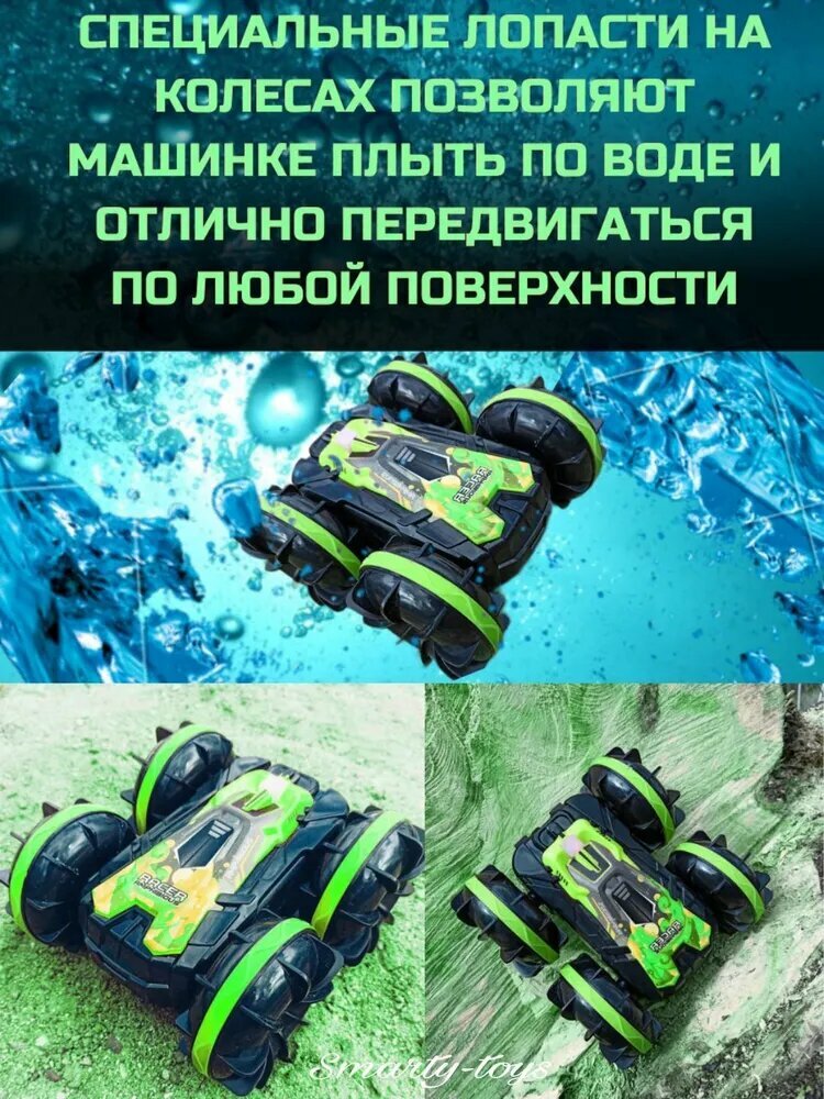 СохранитьМашинка амфибия на радиоуправлении, машина на пульте управления перевертыш с аккумулятором Car Amphibiou, полный привод, Зеленая интересное: