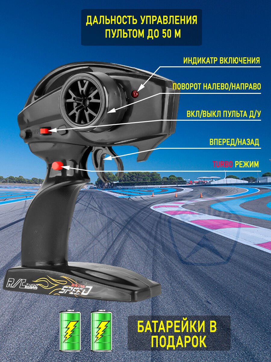 | Комплектация | машина, пульт управления, съемный аккумулятор, зарядное устройство, 4 запасные шины, 6 конусов |