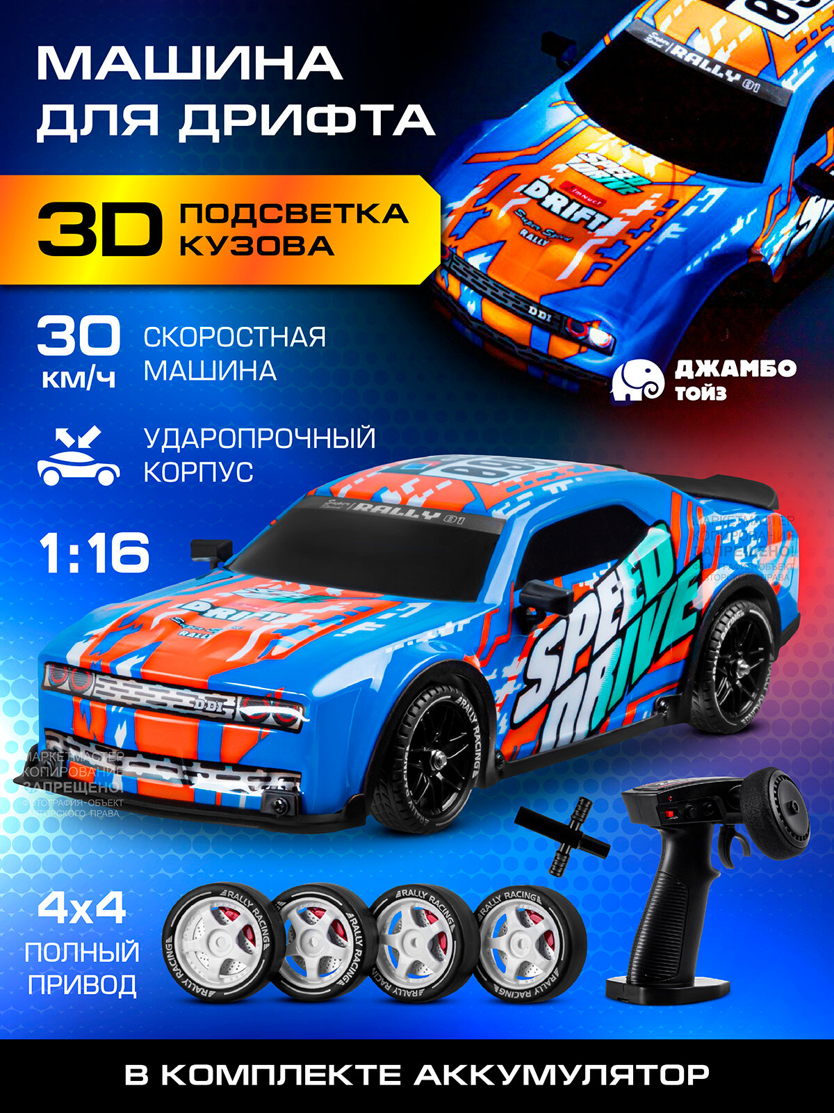 Радиоуправляемая машинка для дрифта с 3D подсветкой корпуса и пульта, ударопрочный пластик, 4 запасных колеса, 4WD, свет, JB0404897