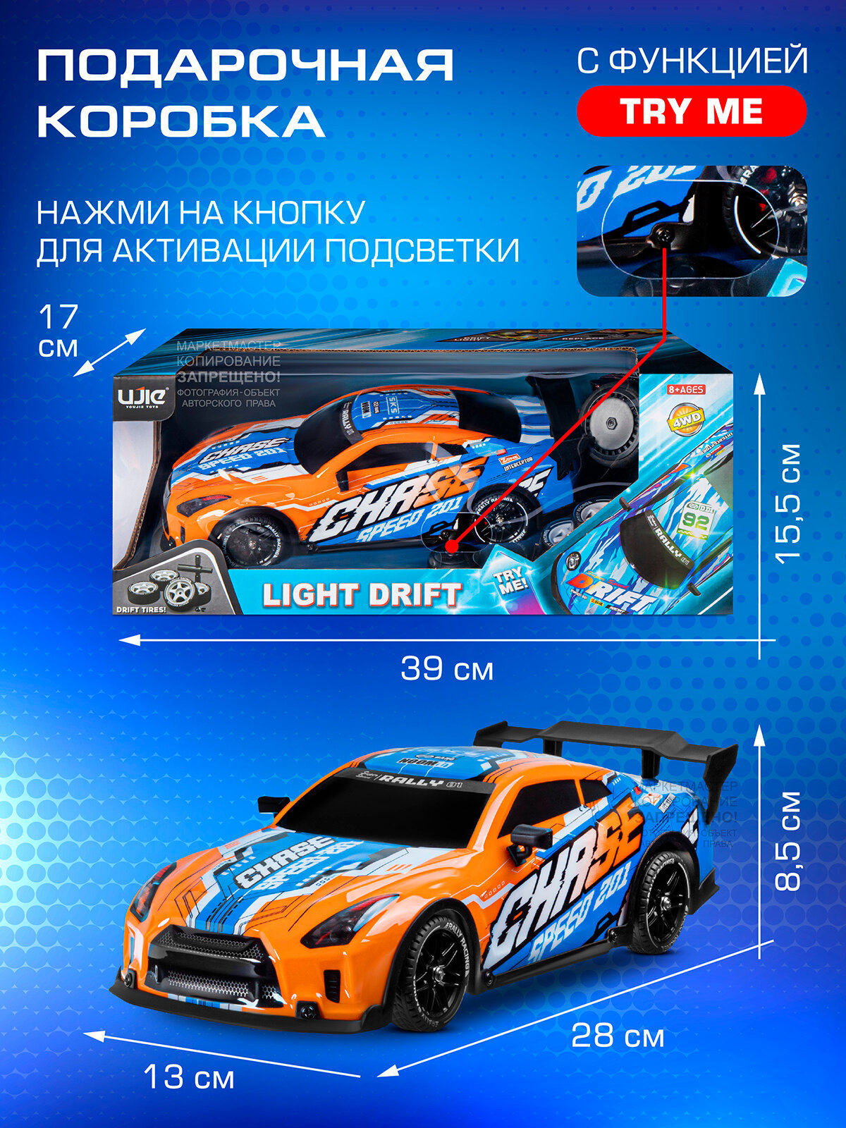 Радиоуправляемая машинка для дрифта с 3D подсветкой корпуса и пульта, ударопрочный пластик, 4 запасных колеса, 4WD, свет, JB0404898