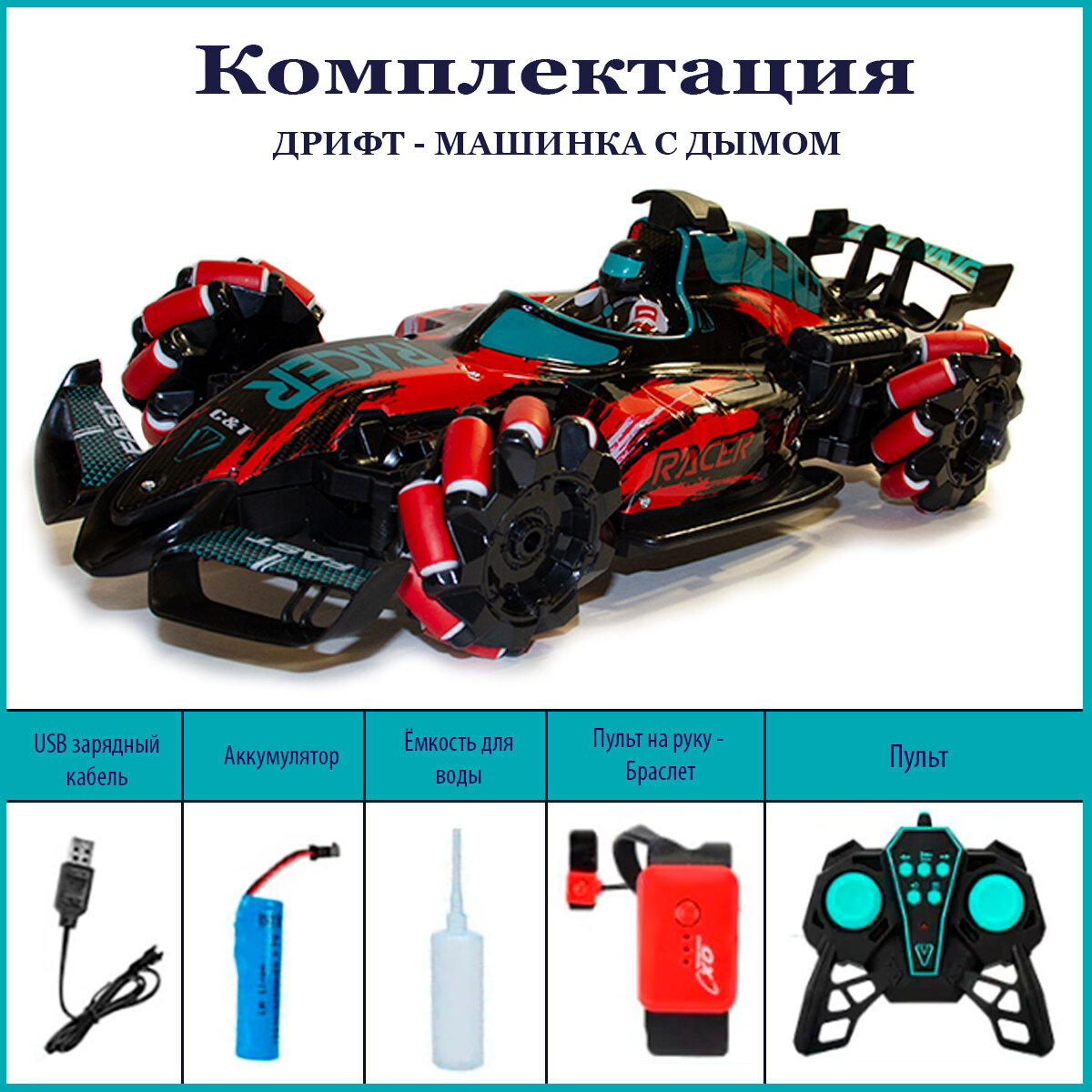 | Комплектация | машинка, пульт, пульт-браслет на руку, зарядное устройство, инструкция, пипетка для заправки водой |