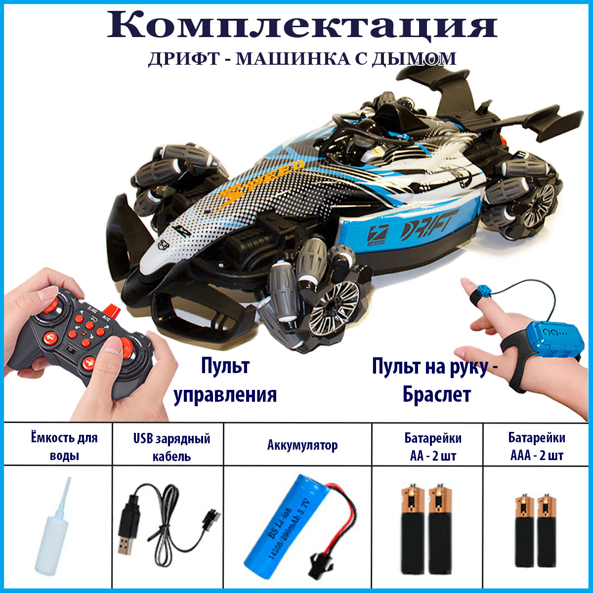 | Комплектация | машинка, пульт, пульт-браслет на руку, зарядное устройство, инструкция, пипетка для заправки водой |