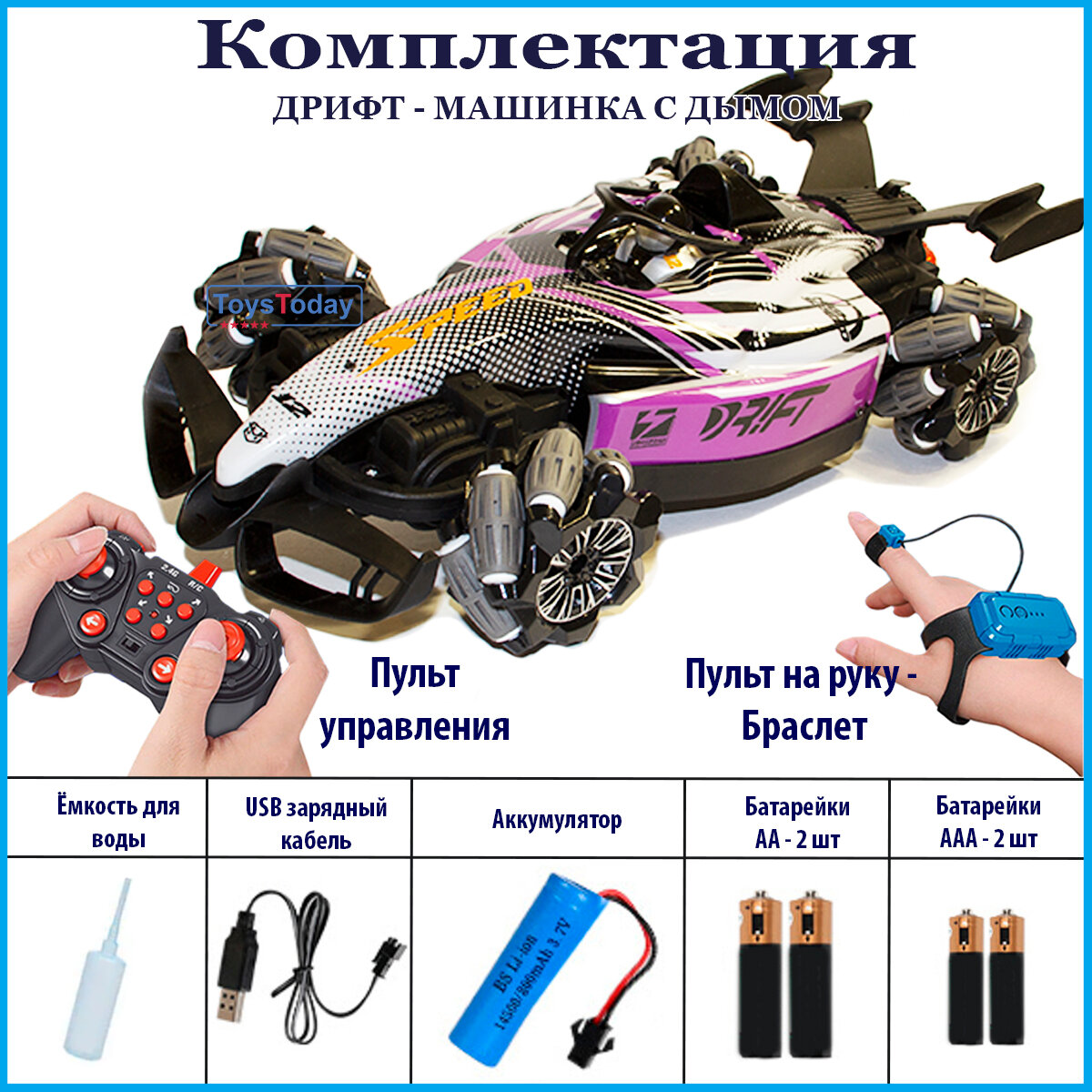 | Комплектация | машинка, пульт, пульт-браслет на руку, зарядное устройство, инструкция, пипетка для заправки водой |
