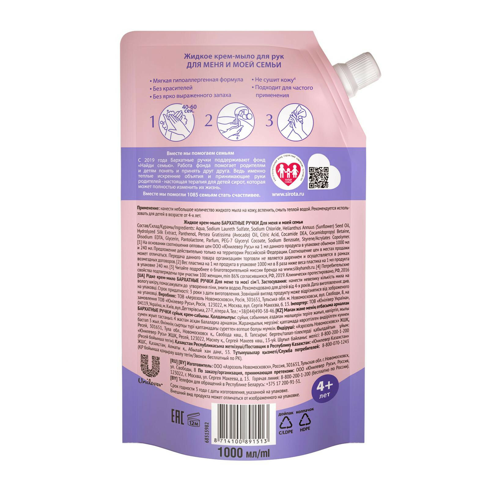 Unilever (Юнилевер) 8058 жидкое крем-мыло Бархатные Ручки Для меня и моей семьи 510 мл