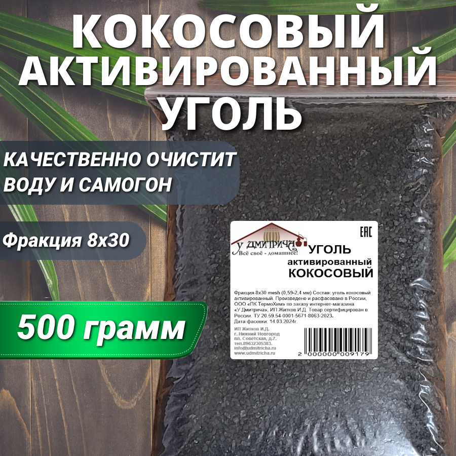 Уголь активированный кокосовый "У Дмитрича" для очистки воды, самогона, воздуха 500гр.