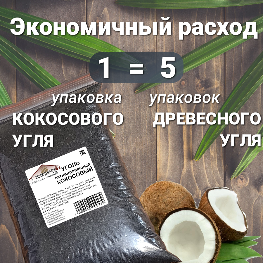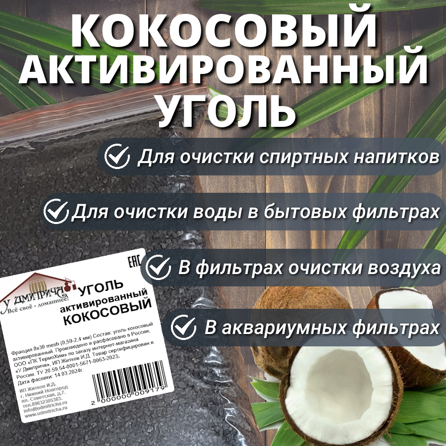 Уголь активированный кокосовый "У Дмитрича" для очистки воды, самогона, воздуха 1500гр.
