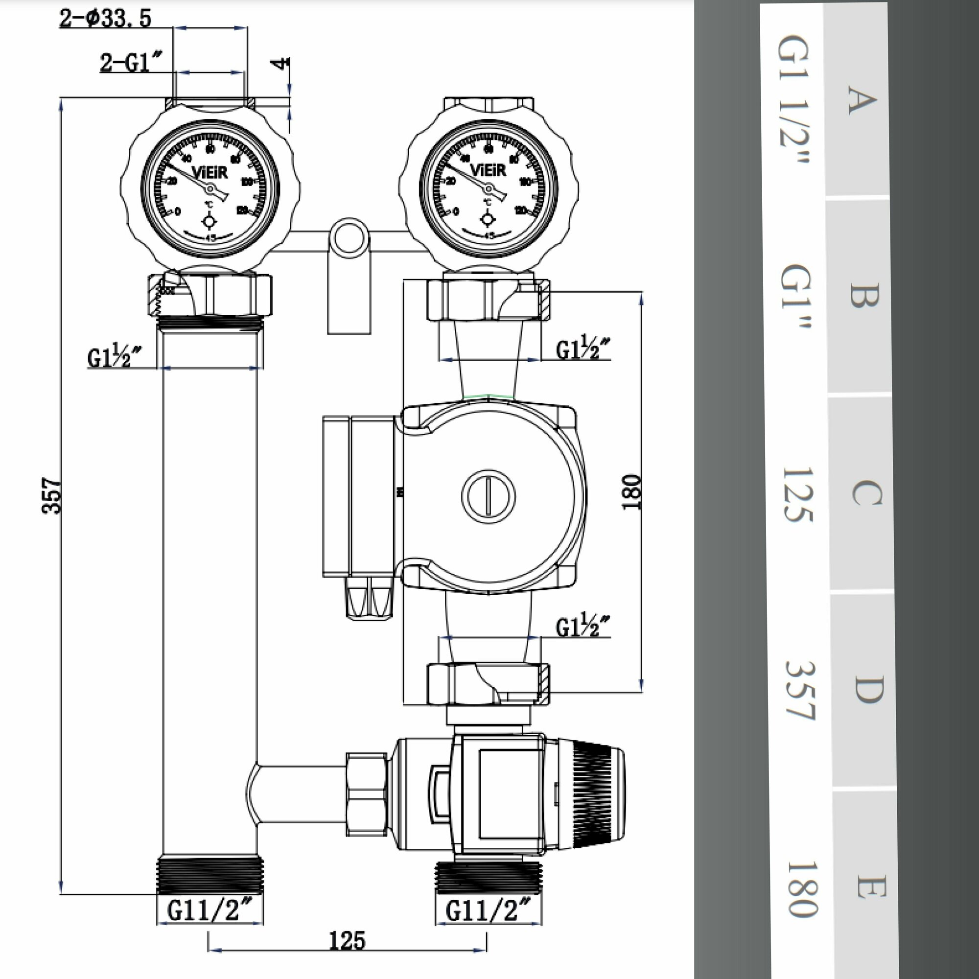 | Комплектация | 1 - съемная рукоятка с синим термометром 2 - съемная рукоятка с красным термометром 3 - циркуляционный насос Vieir ЦН25-6-180 4 - блочная ЕРР теплоизоляция 5 - комплект крепления насосной группы к стене 6* - отсечной шаровый кран 7* - отсечной шаровый кран с обратным клапаном 8 - труба обратной линии с тройником, подключение к коллектору НР 112" (под плоское уплотнение) 9 - 3-х ходовой смесительный клапан (НР 1 1/2" (под плоское уплотнение) для подключения группы к распределительному коллектору 10 - рукоятка для перенастройки температуры подачи теплоносителя. * подключение к контуру ВР 1", накидная гайка НГ 1 1/2". |