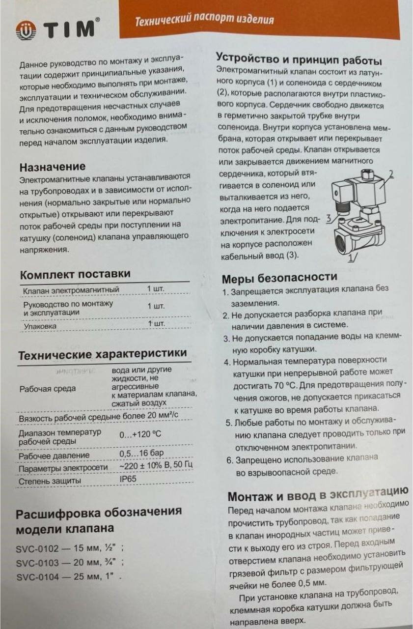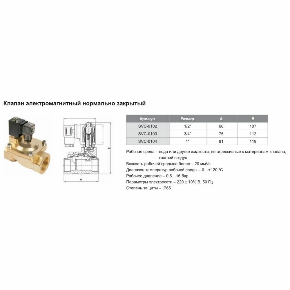 Клапан электромагнитный соленоидный нормально закрытый латунный 1"(ДУ25), 220В, TIM артикул SVC-0104 интересное: