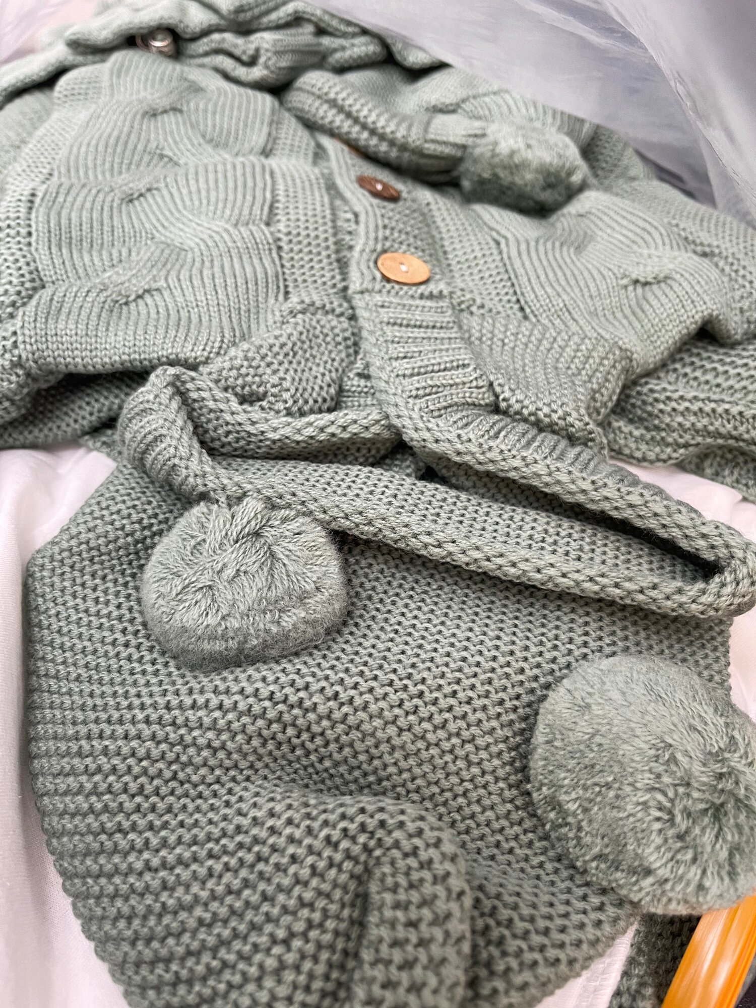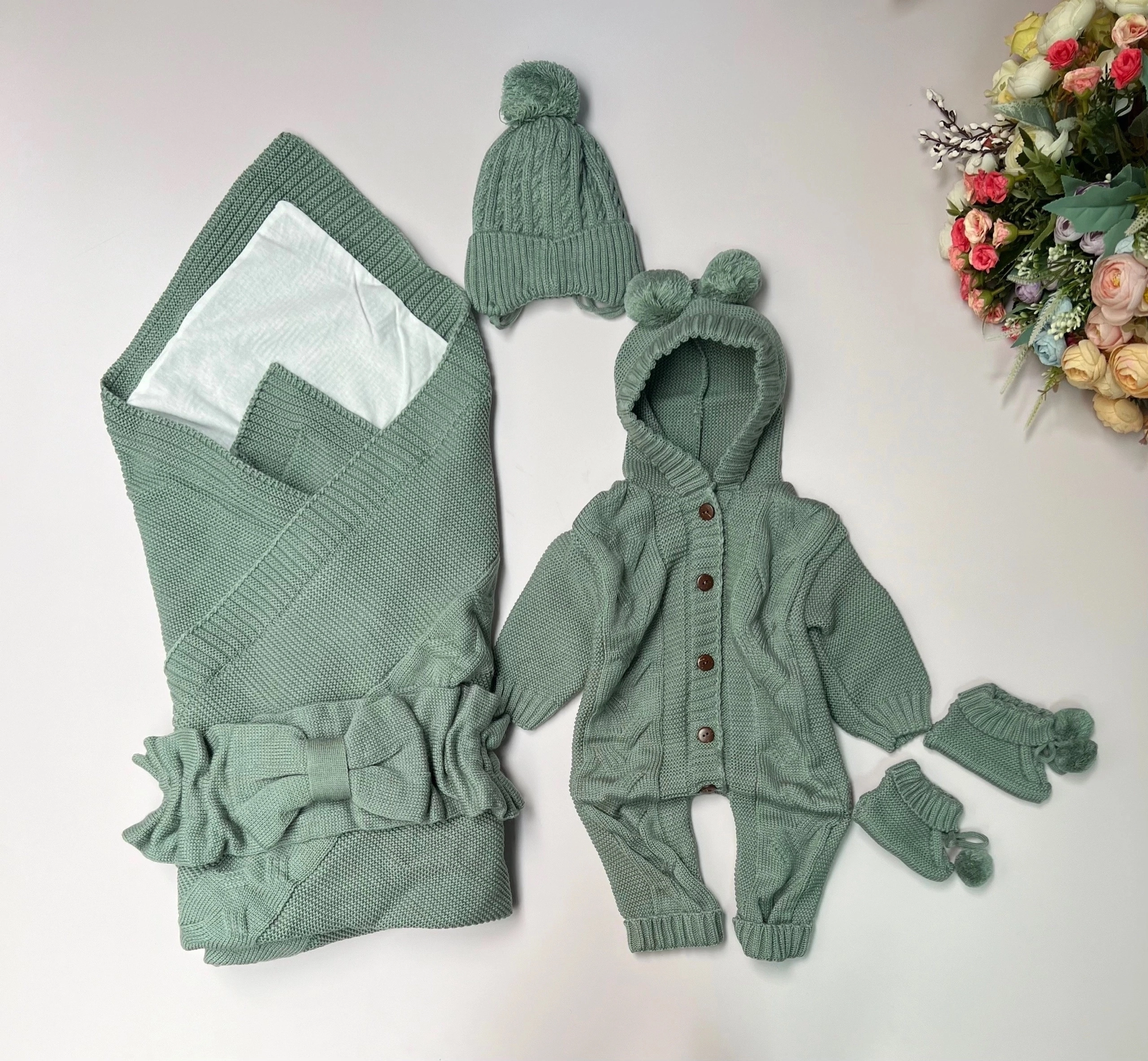 Купить Конверт для новорожденного комплект весна на выписку вязаный 7 предметов Зеленый