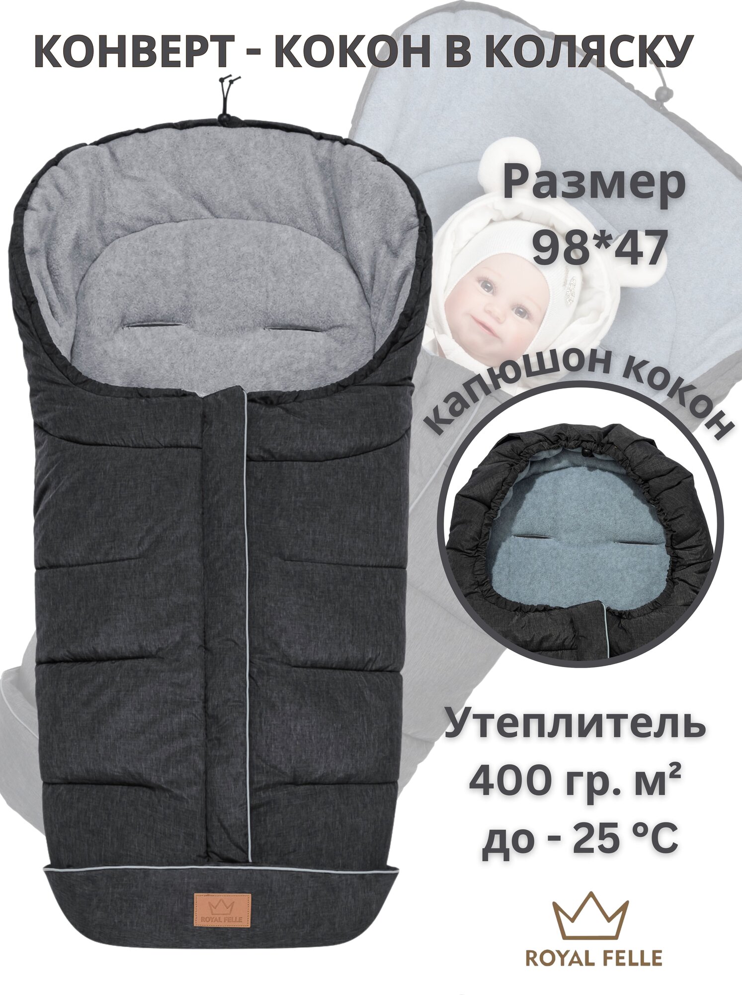 Конверт в коляску для новорожденных осень зима - Royal Felle Winter - Black