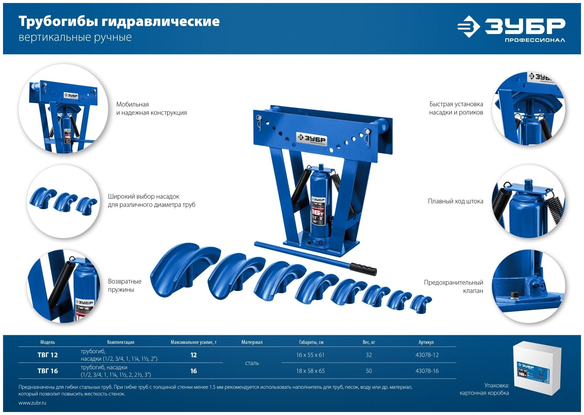 Ниже Вы можете прочитать отзывы на ЗУБР ТГВ-16, 16 т, ручной вертикальный гидравлический трубогиб, Профессионал (43078-16), ознакомится с подробными характеристиками, посмотреть интересные обзоры и фотографии на ЗУБР ТГВ-16, 16 т, ручной вертикальный гидравлический трубогиб, Профессионал (43078-16).