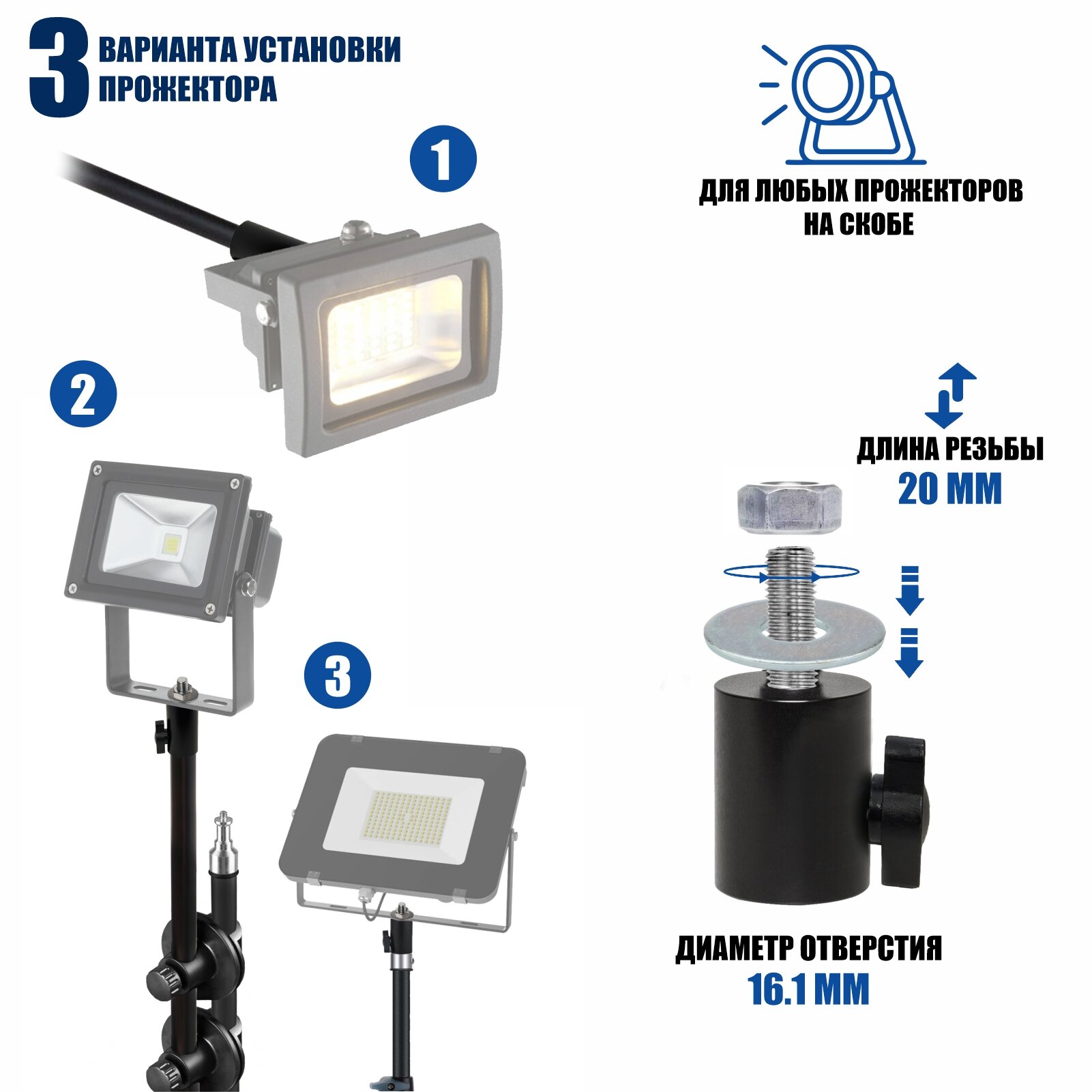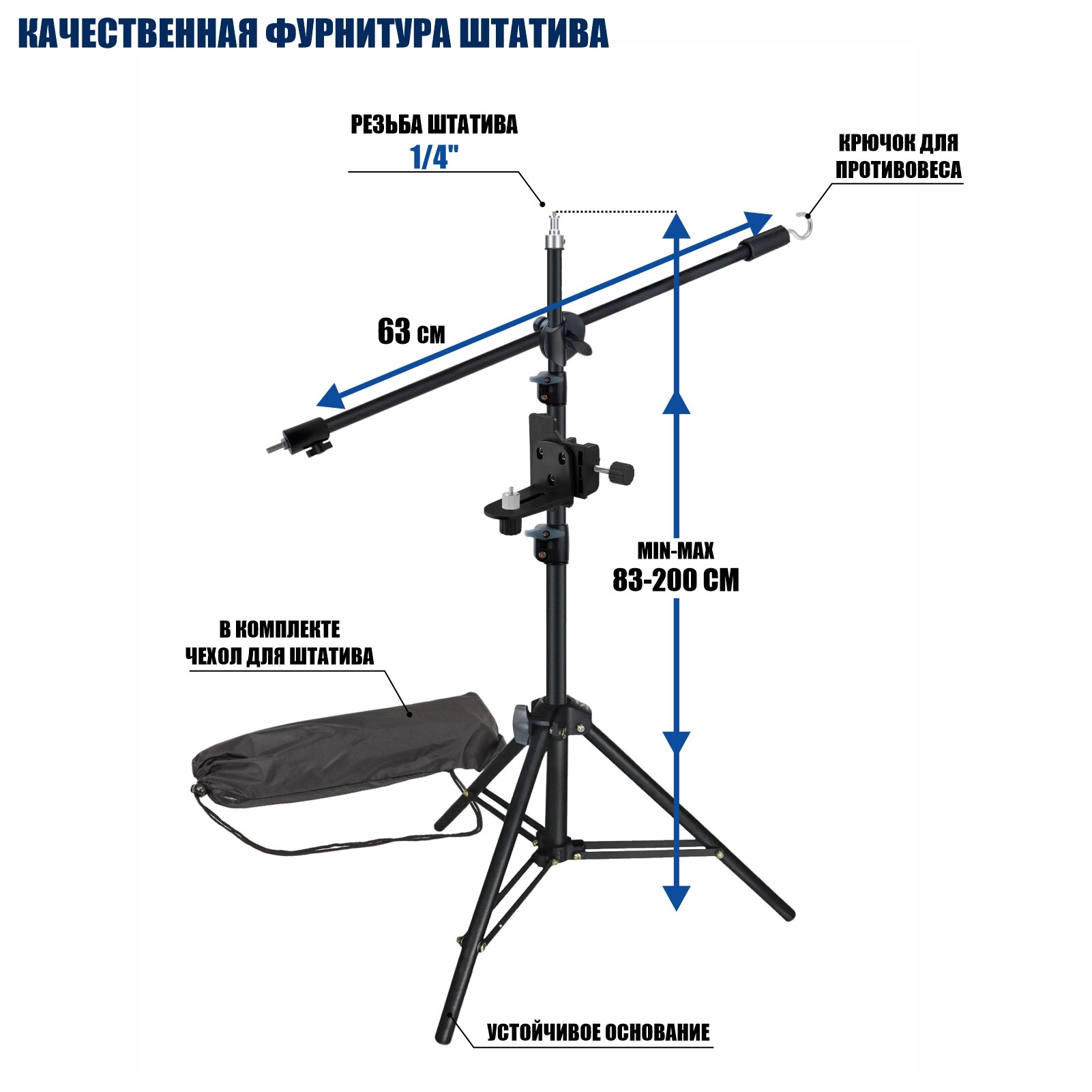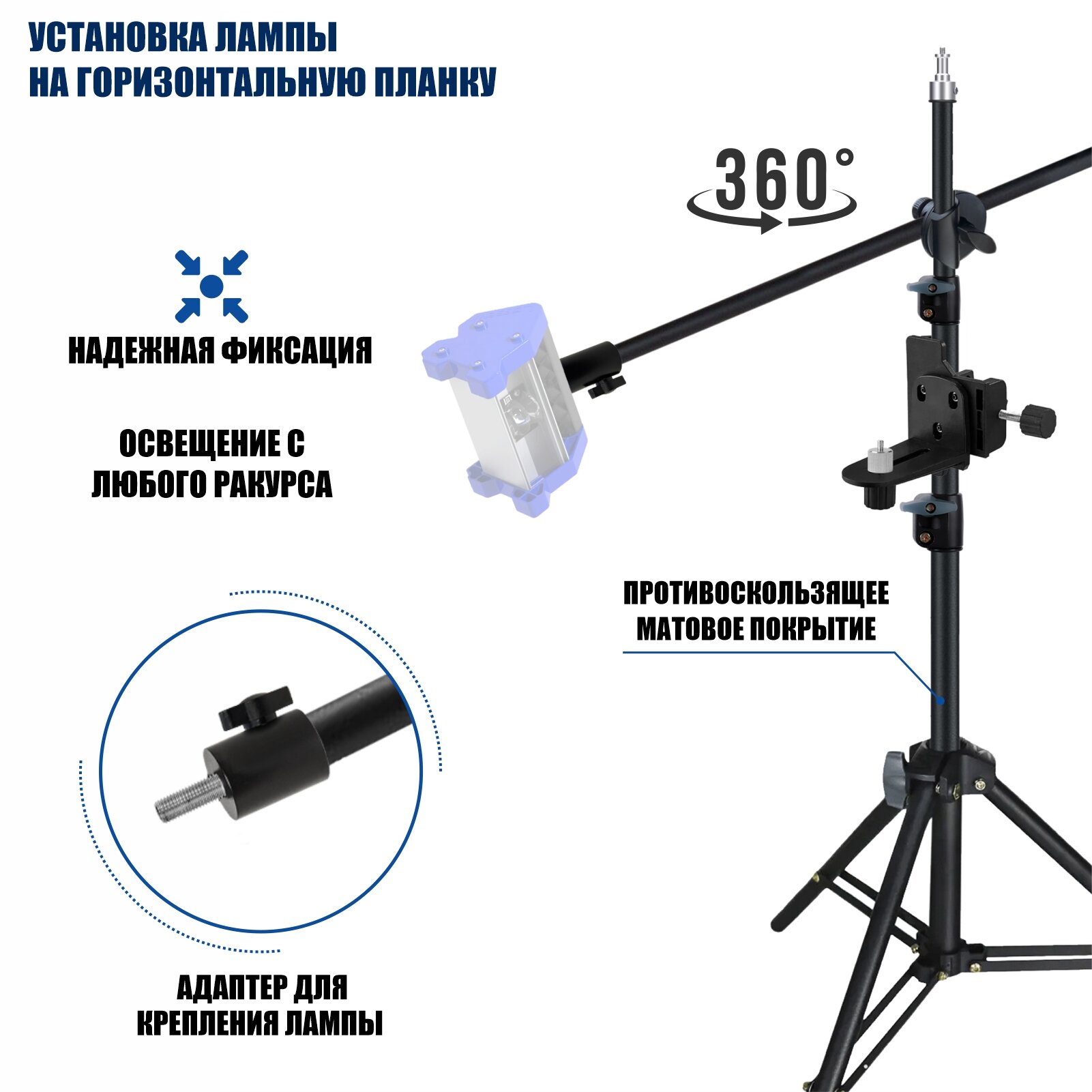 | Дополнительная информация | Регулируемая высота штатива позволяет направлять световой поток в нужную область. В комплект входит журавль, с помощью которого можно увеличить высоту стойки до 240 см |