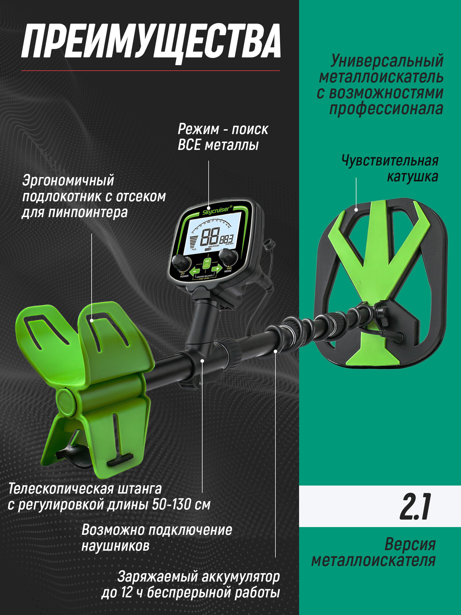 | Комплектация | • Блок управления • Катушка 11х9 DD • Защита на катушку • Телескопическая штанга • Болт и гайка для крепления • Кабель для зарядки |