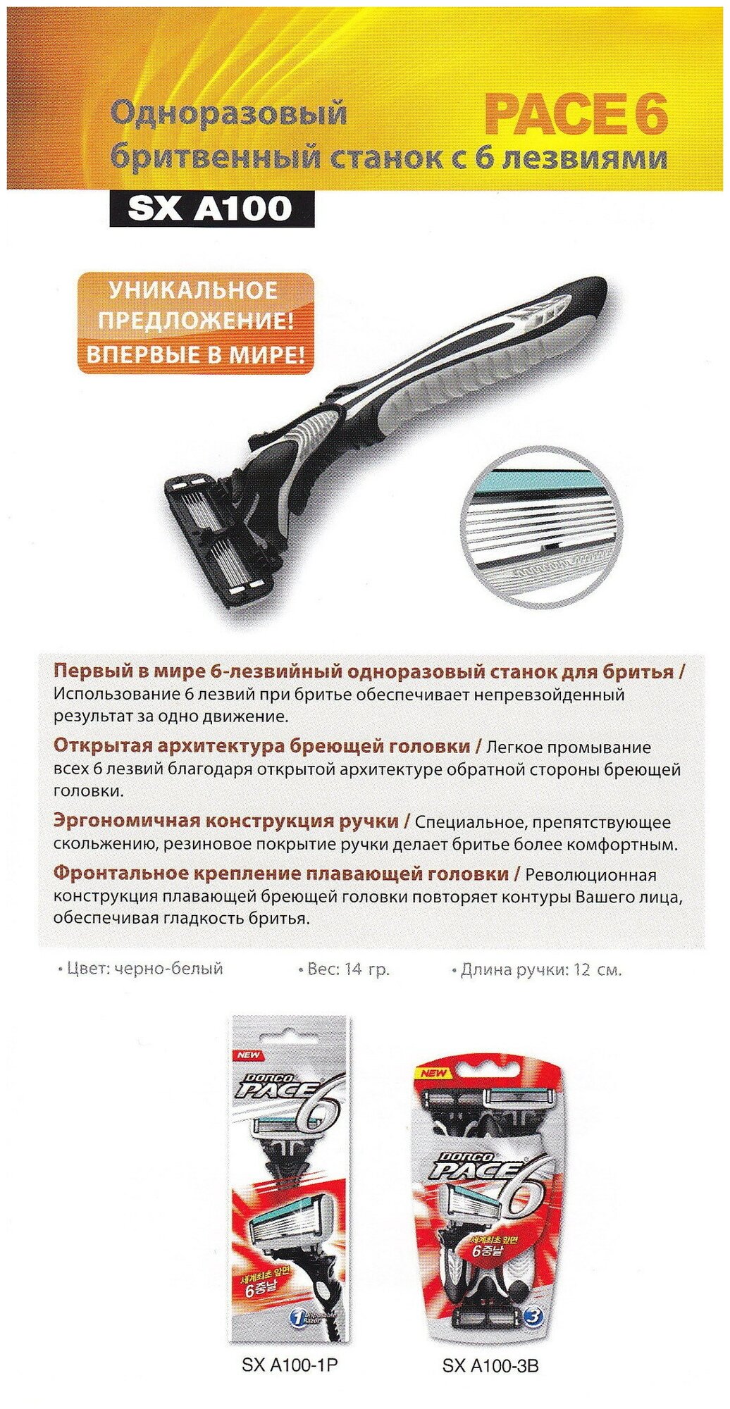Dorco PACE6 (1 станок), 6-лезв.станок, плав.головка, увл.полоска, микрогребень, открыт.архитектура, пластик.прорезиненная ручка