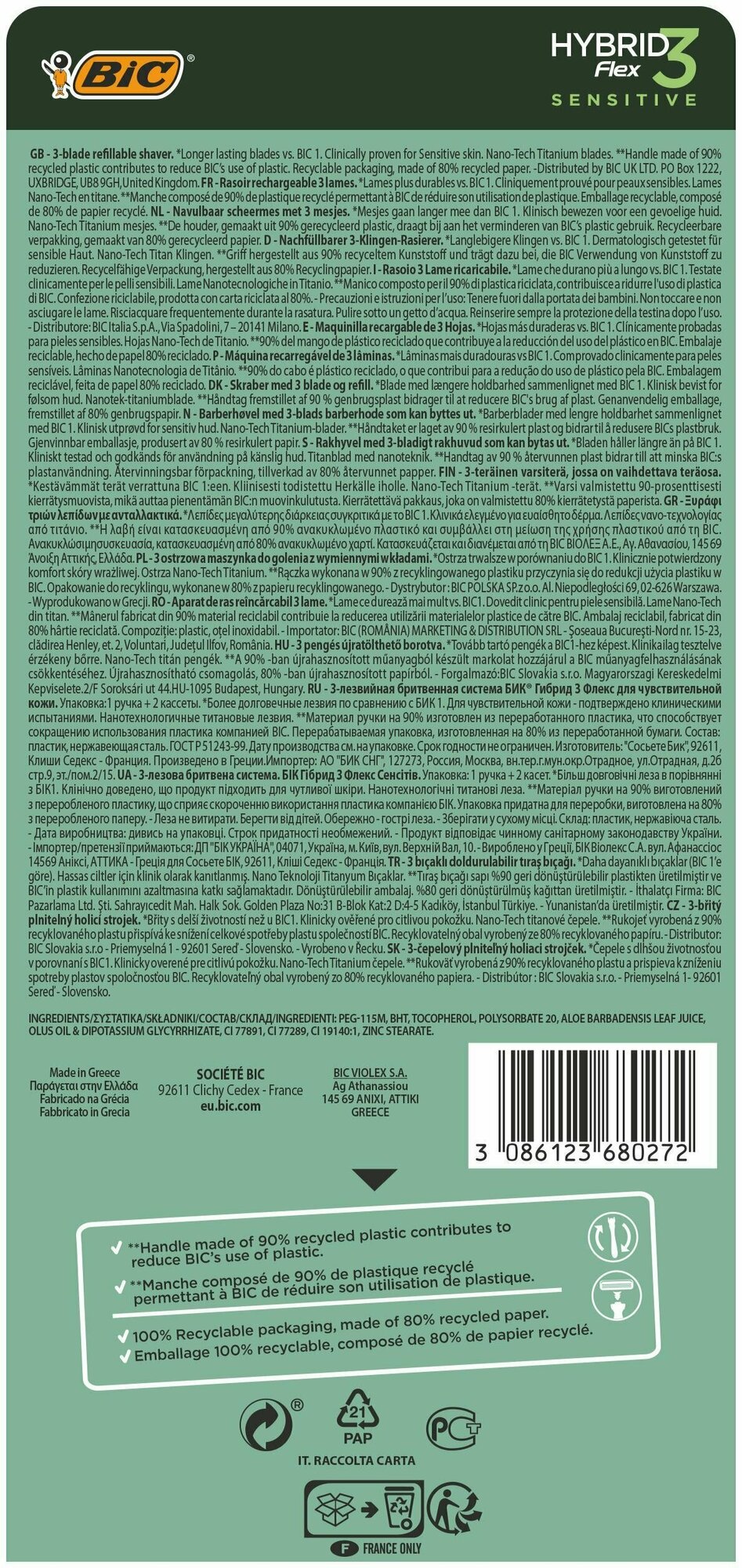 | Комплектация | cтанок для бритья мужской BIC Hybrid 3 Flex Sensitive; 2 сменные кассеты с 3 лезвиями |