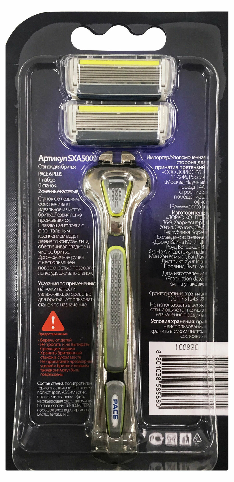 Купить Бритвенный станок Dorco PACE6 Plus (1 станок, 2 кассеты), 6 лезвий + лезвие-триммер, плав.головка, крепление PACE