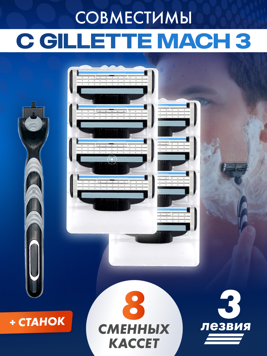 Бритвенный набор Men's Mac 3 мужской, совместим с Gillette Mach 3, 1 станок + 8 сменных кассет по 3 лезвия интересное: