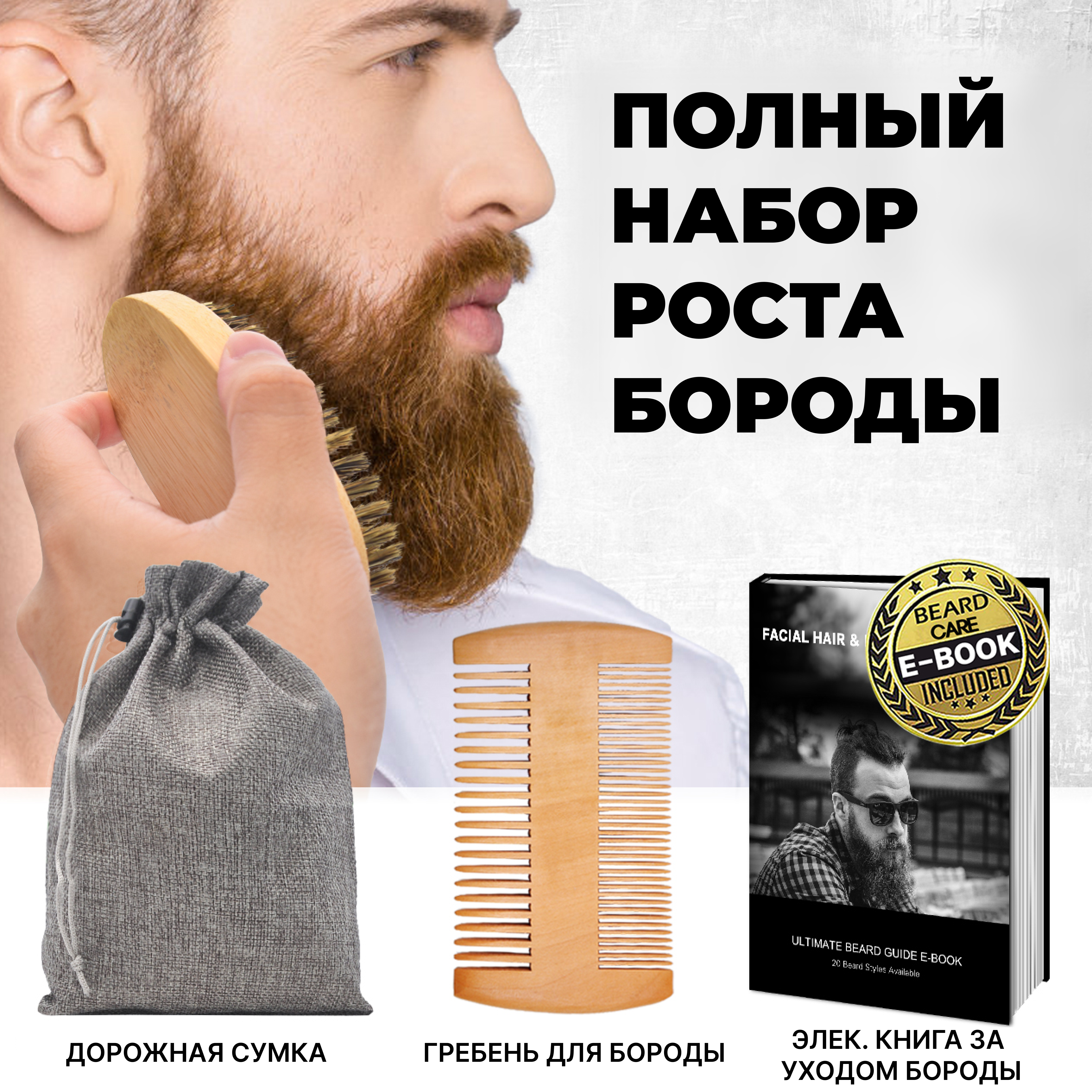 | Состав | 60мл средство для мытья бороды, 30г бальзам для бороды, 30мл сыворотка для роста бороды, 30мл масло для бороды, мезороллер для бороды, гребень для бороды, щетка для бороды, ножницы для бороды, мешочек для хранения, электронная книга по уходу |