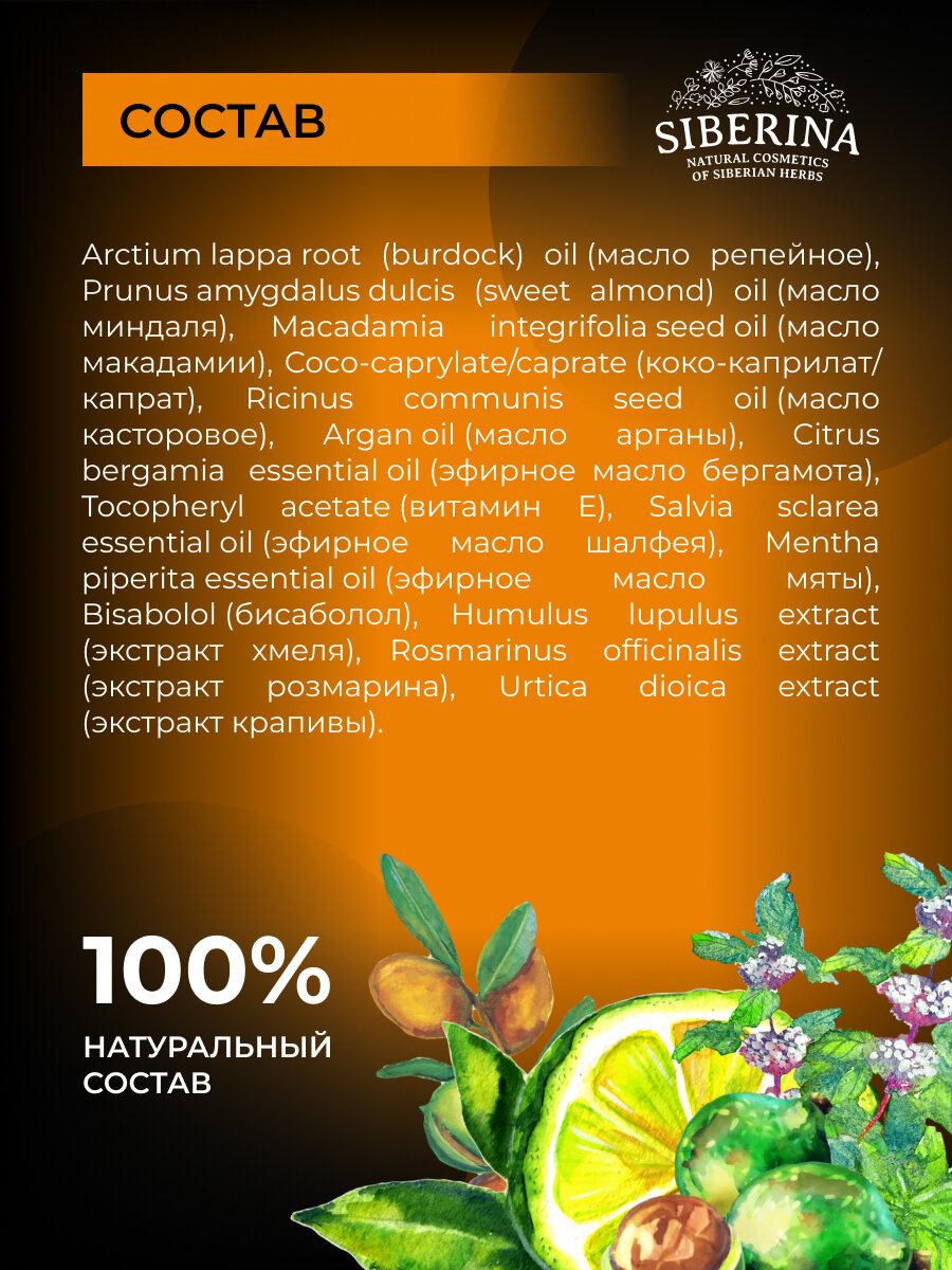 | Состав | Arctium lappa root (burdock) oil (масло репейное), Prunus amygdalus dulcis (sweet almond) oil (масло миндаля), Macadamia integrifolia seed oil (масло макадамии), Coco-caprylate/caprate (коко-каприлат/капрат), Ricinus communis seed oil (масло касторовое), Argan oil (масло арганы), Citrus bergamia essential oil (эфирное масло бергамота), Tocopheryl аcetate (витамин Е), Salvia sclarea essential oil (эфирное масло шалфея), Mentha piperita essential oil (эфирное масло мяты), Bisabolol (бисаболол), Humulus lupulus extract (экстракт хмеля), Rosmarinus officinalis extract (экстракт розмарина), Urtica dioica extract (экстракт крапивы). |