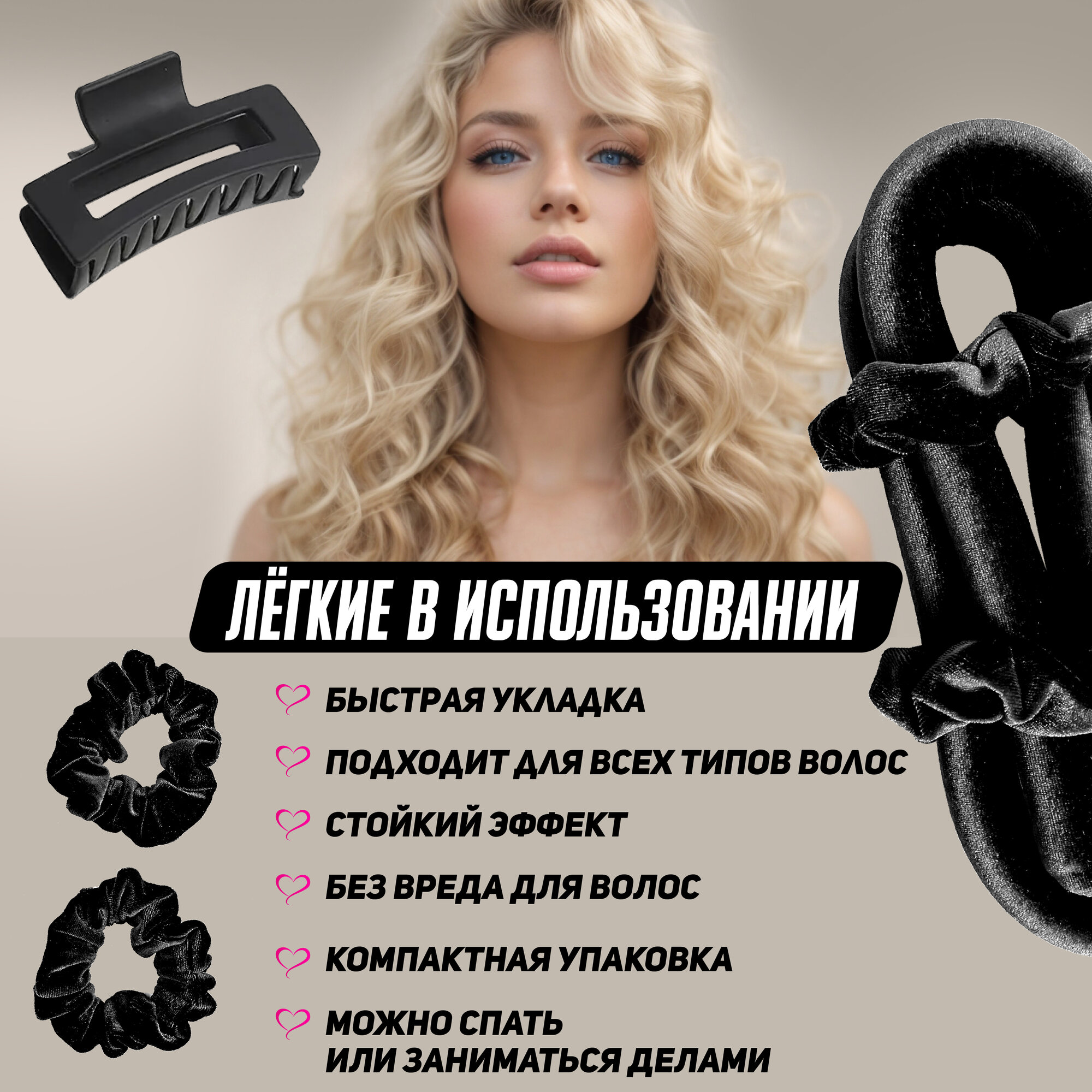 | Комплектация | мягкие бигуди валик, 2 резинки, крабик для волос |