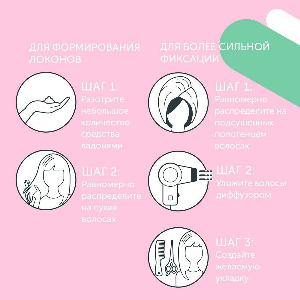 | Способ применения | для формирования локонов растереть небольшое количество ладонями и равномерно распределить на сухих волосах. Для достижения более сильной фиксации равномерно распределить на подсушенных полотенцем волосах и уложить диффузором. Создать желаемую укладку |