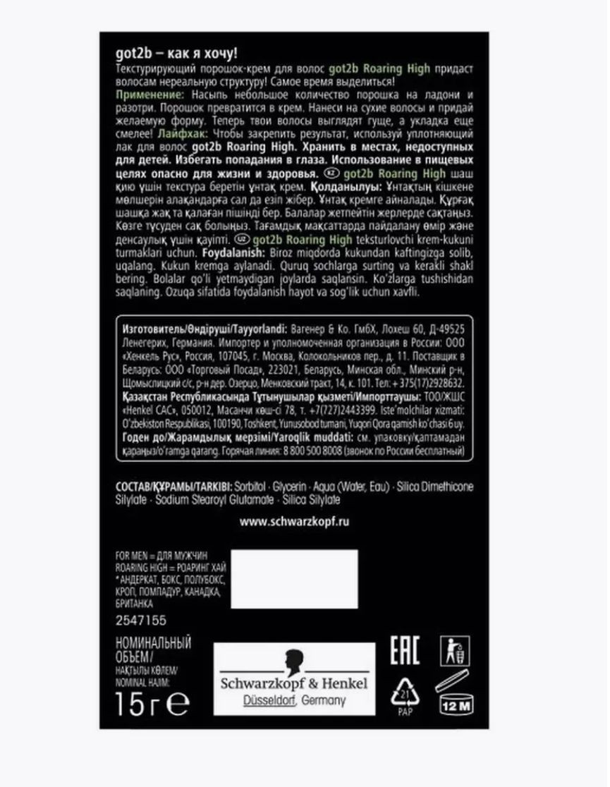 | Способ применения | насыпь небольшое количество порошка на ладони и разотри; порошок превратится в крем; нанеси на сухие волосы и придай желаемую форму |