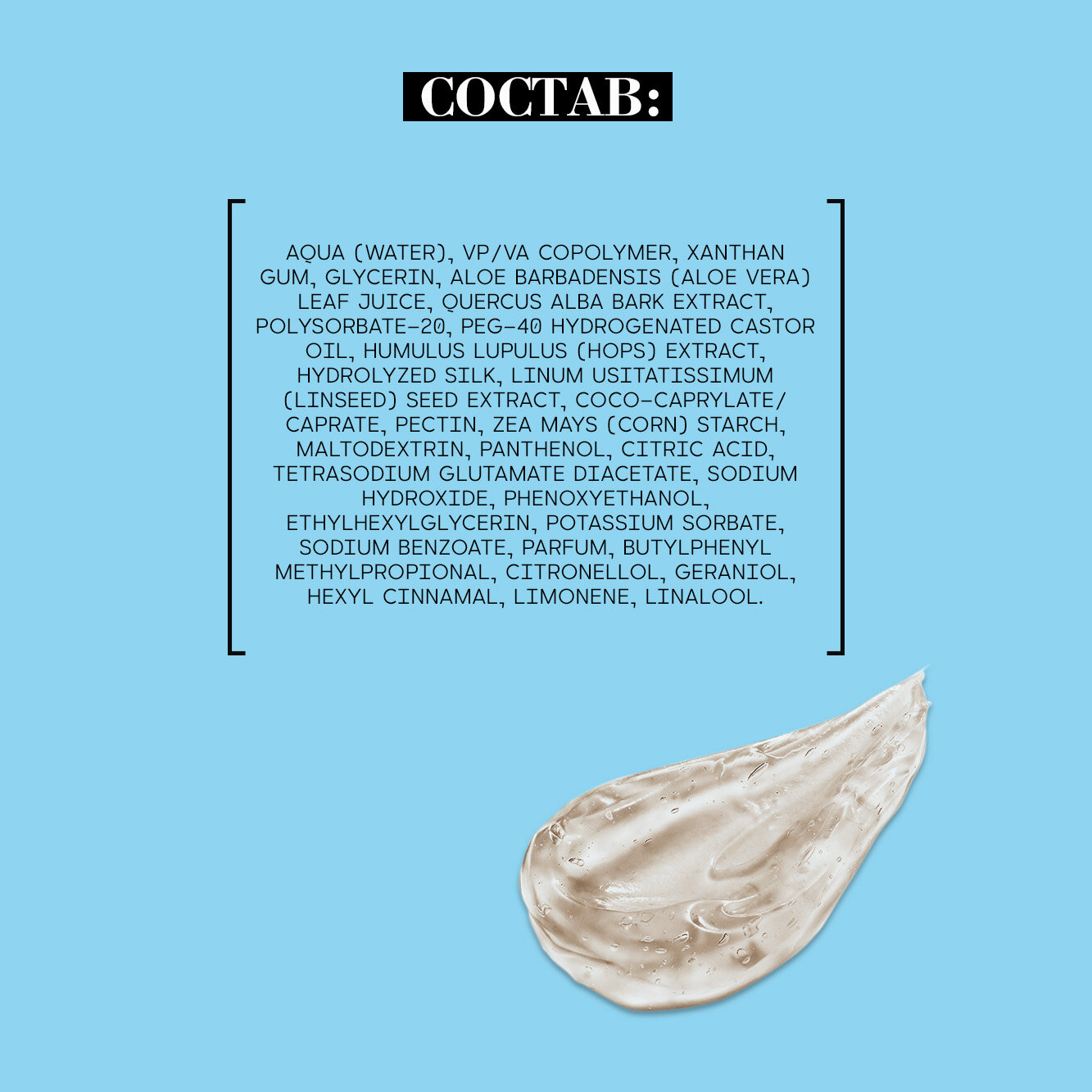 | Состав | AQUA (WATER), VP/VA COPOLYMER, XANTHAN GUM, GLYCERIN, ALOE BARBADENSIS (ALOE VERA) LEAF JUICE, QUERCUS ALBA BARK EXTRACT, POLYSORBATE-20, PEG-40 HYDROGENATED CASTOR OIL, HUMULUS LUPULUS (HOPS) EXTRACT, HYDROLYZED SILK, LINUM USITATISSIMUM (LINSEED) SEED EXTRACT, COCO-CAPRYLATE/ CAPRATE, PECTIN, ZEA MAYS (CORN) STARCH, MALTODEXTRIN, PANTHENOL, CITRIC ACID, TETRASODIUM GLUTAMATE DIACETATE, SODIUM HYDROXIDE, PHENOXYETHANOL, ETHYLHEXYLGLYCERIN, POTASSIUM SORBATE, SODIUM BENZOATE, PARFUM, BUTYLPHENYL METHYLPROPIONAL, CITRONELLOL, GERANIOL, HEXYL CINNAMAL, LIMONENE, LINALOOL. |