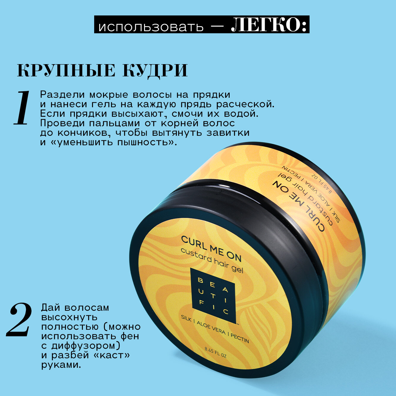 | Способ применения | 1) Толстые крупные кудри: раздели мокрые волосы на небольшие прядки и нанеси гель-кастард на каждую прядь при помощи расчески. Если прядки начинают высыхать, смочи их водой. Проведи пальцами от корней волос до кончиков, чтобы вытянуть завитки и «уменьшить пышность». 2) Пышные волнистые локоны: возьми немного геля-кастарда на влажные руки (средство должно быть смешано с водой, чтобы избежать липкости), нанеси на влажные или мокрые волосы. Опусти голову вниз, чтобы придать больший объем. После нанесения дай волосам высохнуть полностью (можно использовать фен с диффузором), затем разбей «каст» руками. |