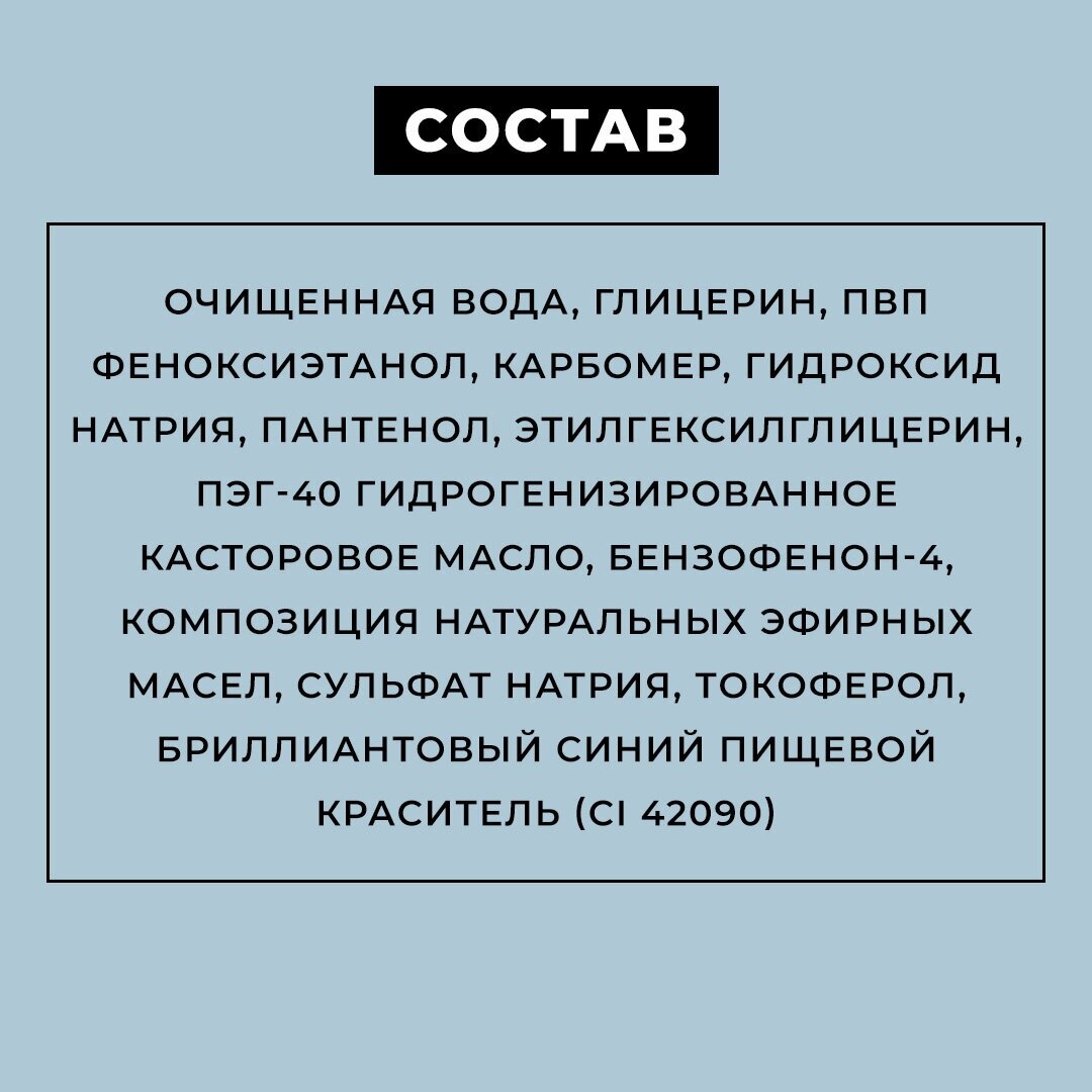 | Состав | Очищенная вода, Поливинилпирролидон (ПВП), Феноксиэтанол, Карбомер, Глицерин, Гидроксид натрия, Пантенол, Этилгексилглицерин, ПЭГ-40 Гидрогенизированное касторовое масло, Бензофенон-4, Композиция натуральных эфирных масел, Сульфат натрия, Хлорид натрия, Хинолиновый желтый краситель (CI 47005), Бриллиантовый синий пищевой краситель (CI 42090). |