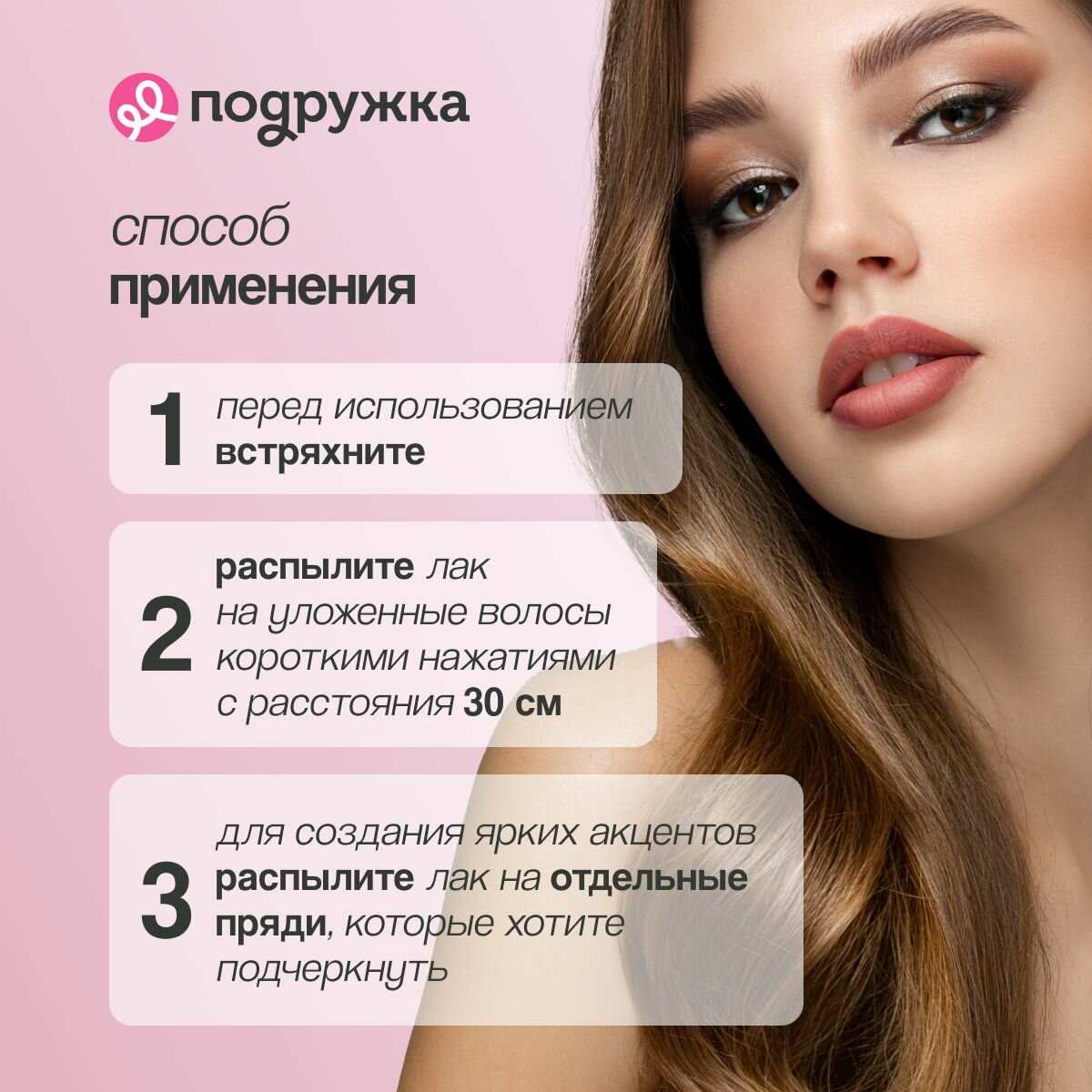 | Способ применения | Распылите лак на уложенные волосы короткими нажатиями с расстояния 30 см. Для создания ярких акцентов распыляйте лак на отдельные пряди, которые хотите подчеркнуть |