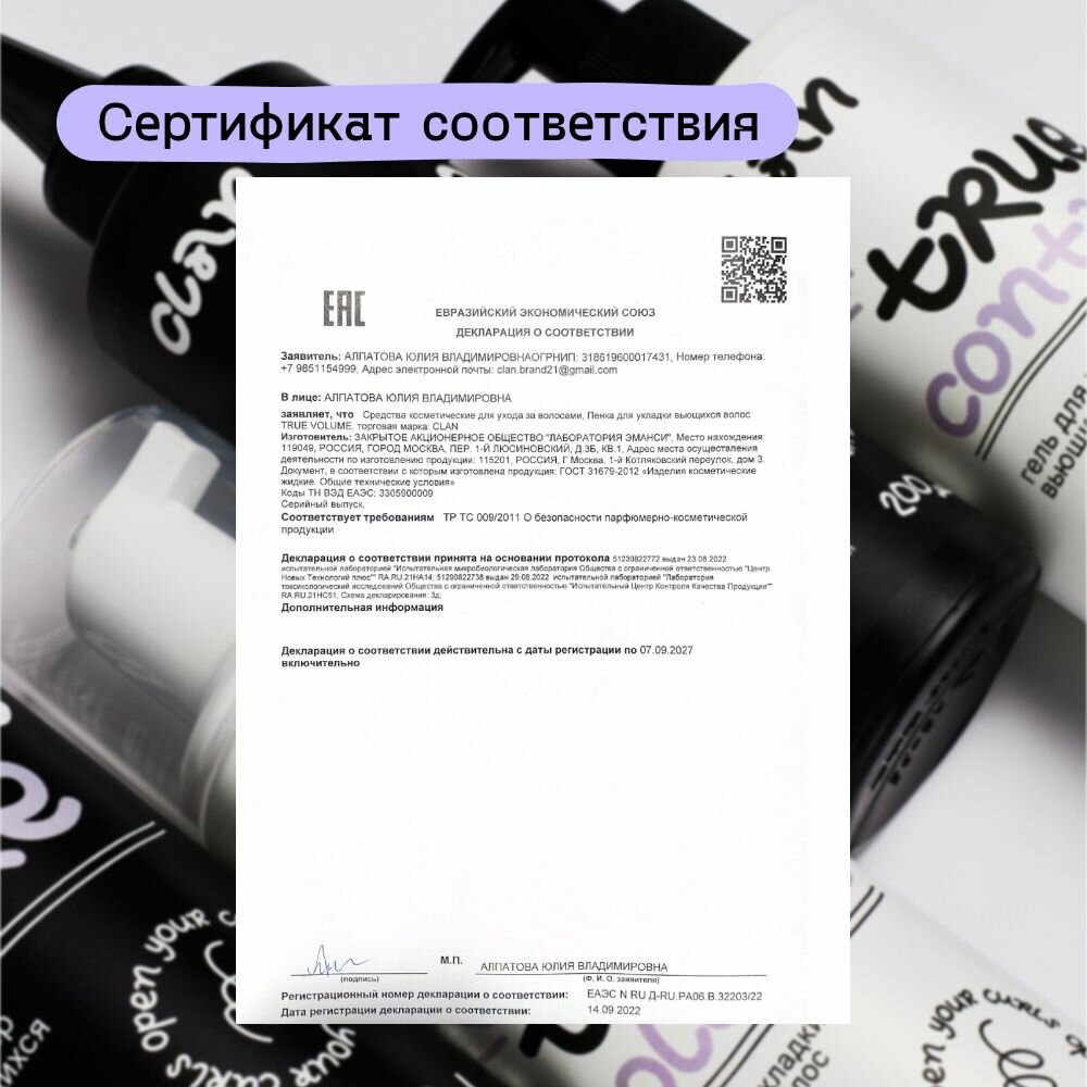 CLAN Пенка для укладки вьющихся и кудрявых волос TRUE VOLUME 160 мл. интересное: