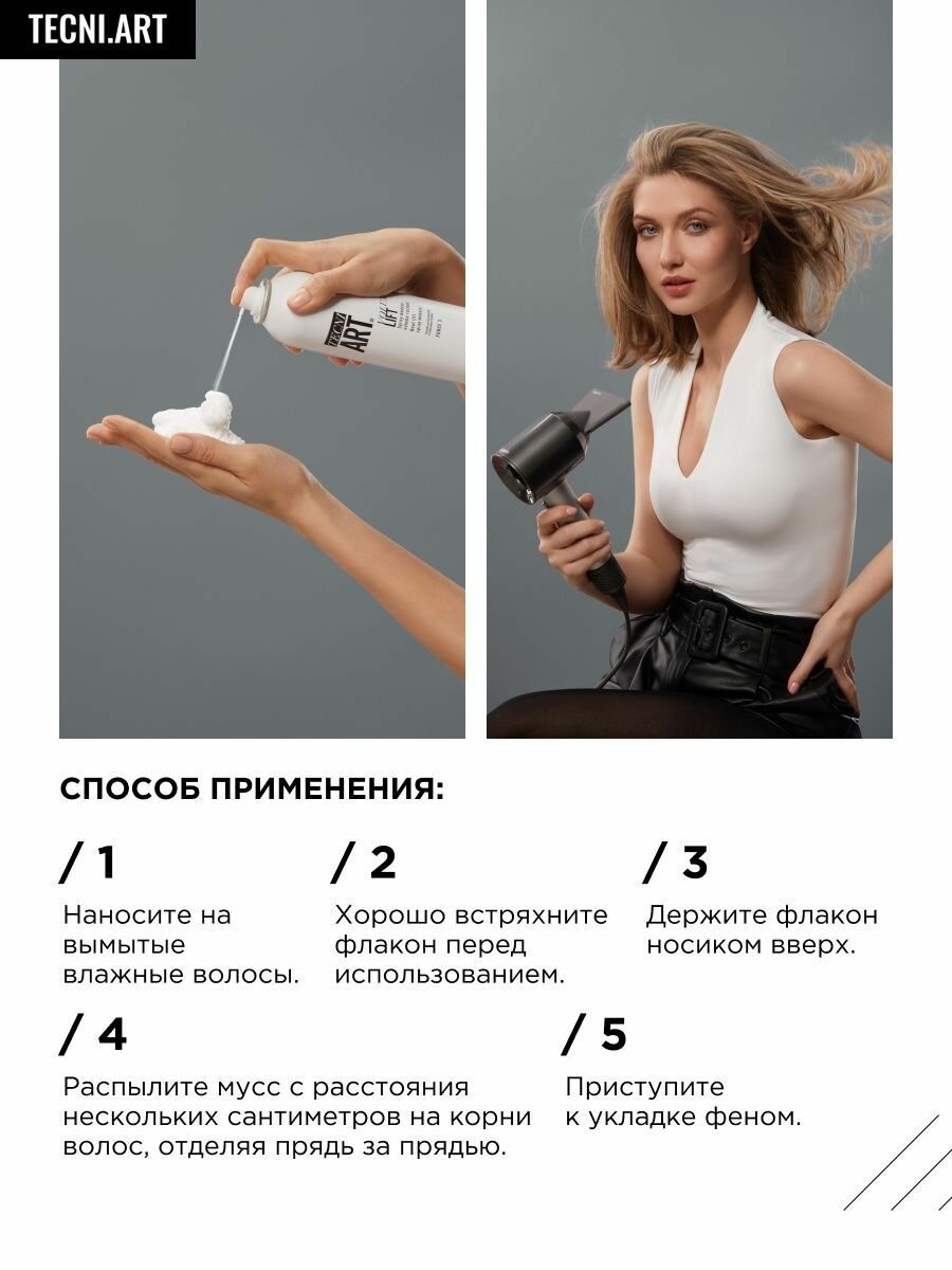 | Способ применения | наносите на вымытые влажные волосы. Хорошо встряхните флакон перед использованием. Держите флакон носиком вверх. Распылите мусс с расстояния нескольких сантиметров на корни волос, отделяя прядь за прядью. Приступите к укладке феном |