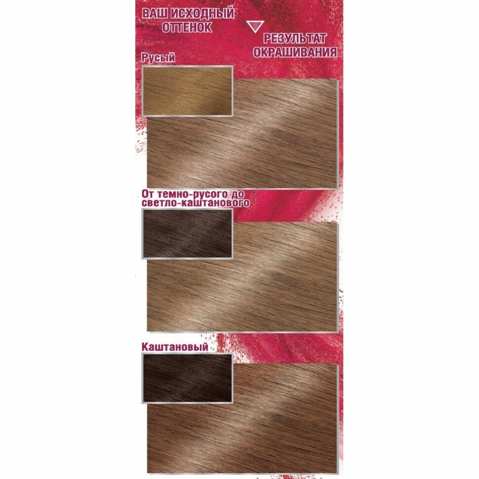 | Способ применения | мешайте крем-краску и молочко-проявитель. Нанесите на волосы. Подождите рекомендованное на упаковке время и смойте. Нанесите бальзам. Смойте. Для усиления защиты цвета от вымывания используйте шампунь для окрашенных волос |