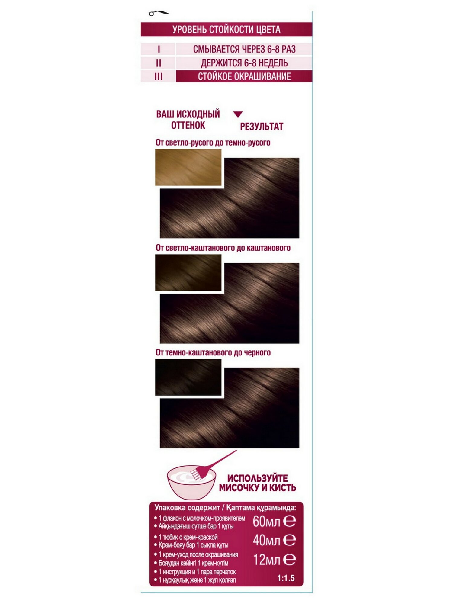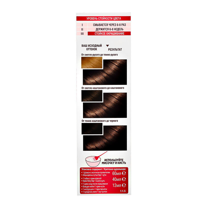 | Способ применения | мешайте крем-краску и молочко-проявитель. Нанесите на волосы. Подождите рекомендованное на упаковке время и смойте. Нанесите бальзам. Смойте. Для усиления защиты цвета от вымывания используйте шампунь для окрашенных волос |