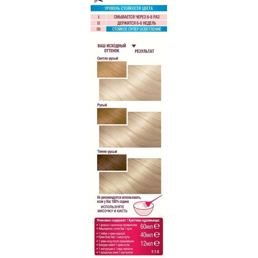 | Комплектация | - флакон с молочком-проявителем (60 мл); - тюбик с обесцвечивающим кремом (40 мл); - крем-уход после окрашивания (10 мл); - инструкция; - пара перчаток |