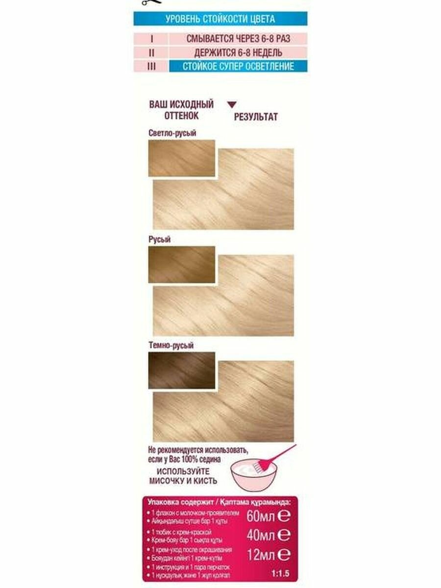 | Комплектация | - флакон с молочком-проявителем (60 мл); - тюбик с обесцвечивающим кремом (40 мл); - крем-уход после окрашивания (10 мл); - инструкция; - пара перчаток |
